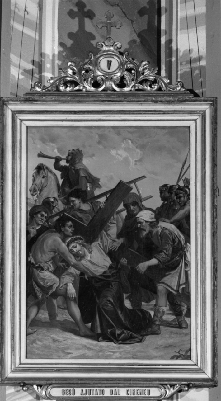 Gesù, in ginocchio sotto il peso della croce, viene aiutato da Simone Cireneo a rialzarsi