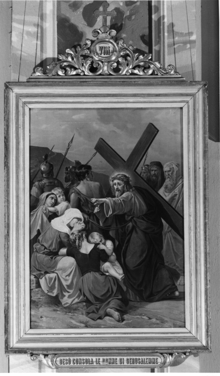 Cristo durante la salita al Calvario, rivolge lo sguardo ed indirizza la mano verso le donne di Gerusalemme, che con i bimbi i braccio, piangono al suo passaggio
