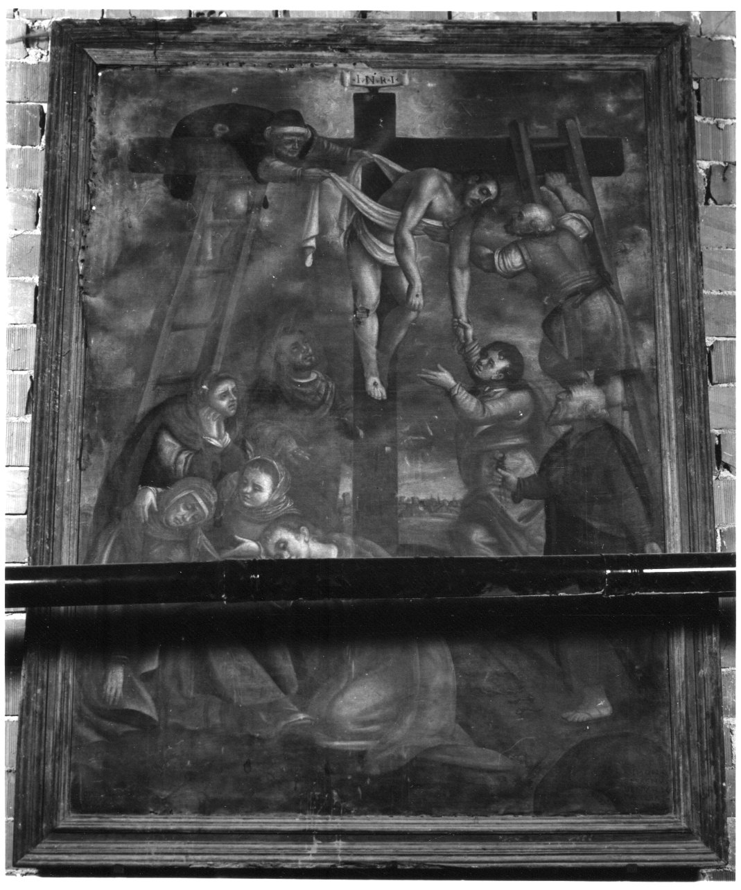 Tela di forma rettangolare, in cornice listellare di legno dipinto; nel registro superiore, Cristo viene calato dalla croce, da due figure maschili. In basso a sinistra, la Vergine svenuta dal dolore, è circondata da due pie donne; dietro di lei, la Maddalena si dispera con le mani intrecciate