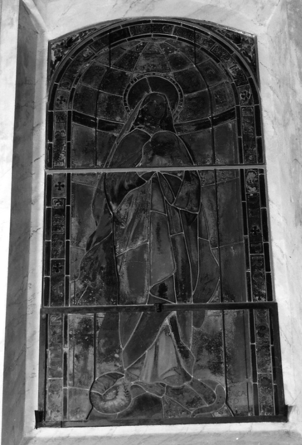 La vetrata è legata a piombo e dipinta. La Madonna, con manto azzurro e abito e velo bianchi, stante sul globo, calpesta il serpente e tiene con le due mani la medaglia miracolosa
