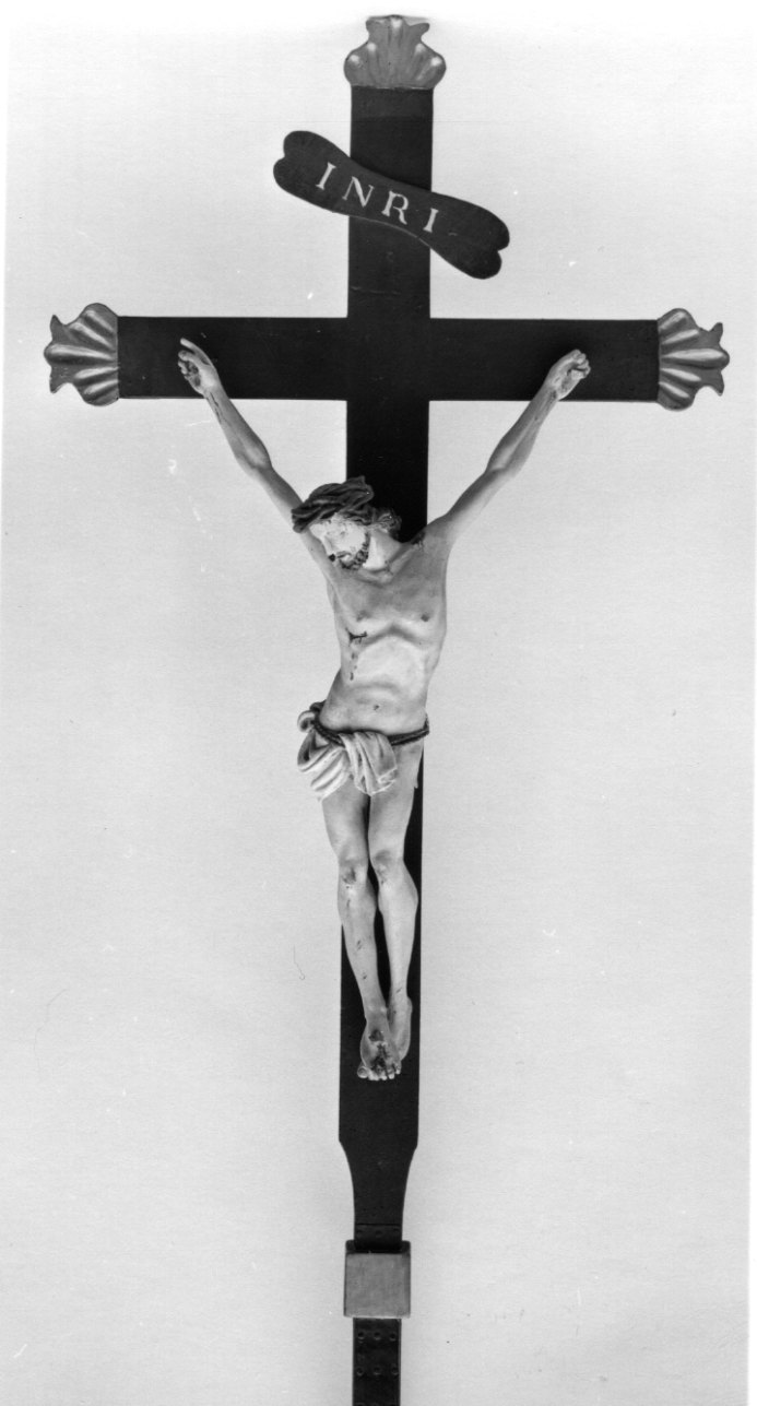 Croce nera con apici dorati e lavorati; il Cristo è in legno trattato color rosa