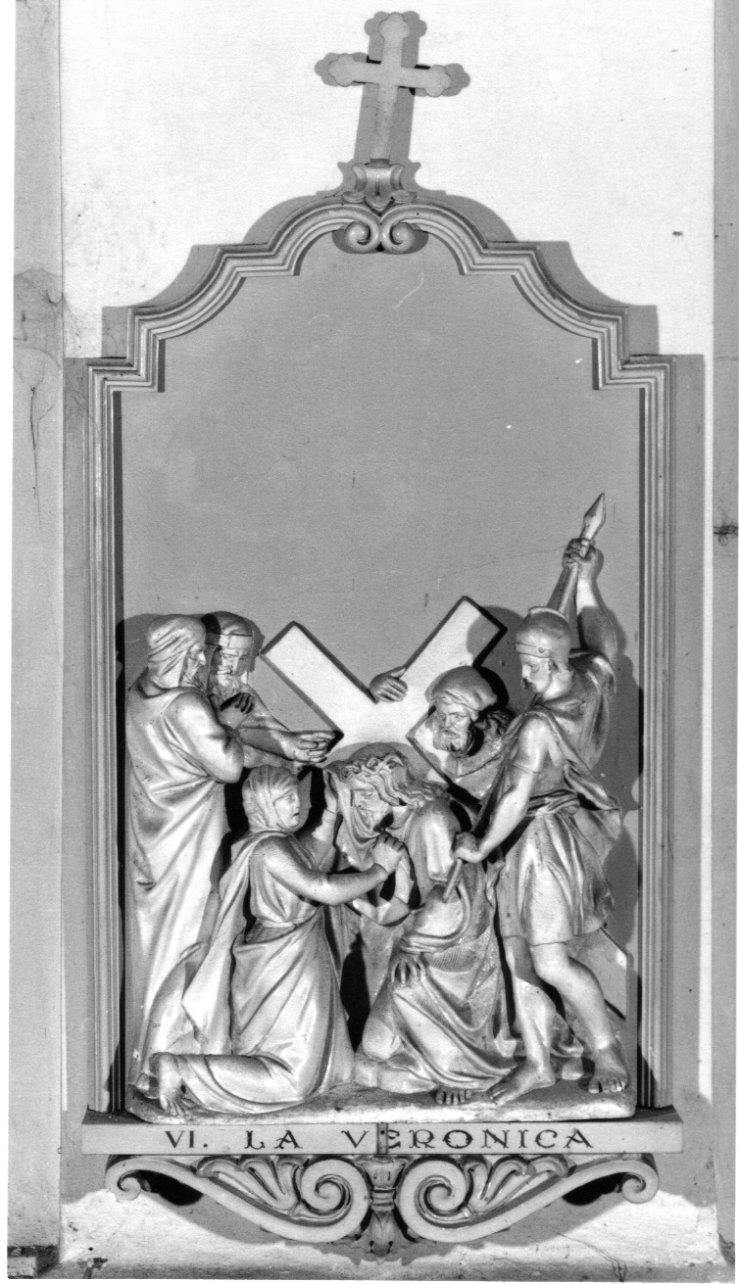 Mentre Gesù cade in ginocchio, suscitando uno slancio verso il basso del Cireneo che lo sta aiutando a portare la croce, la Veronica gli asciuga il volto dal sudore, dal sangue e dalle lacrime