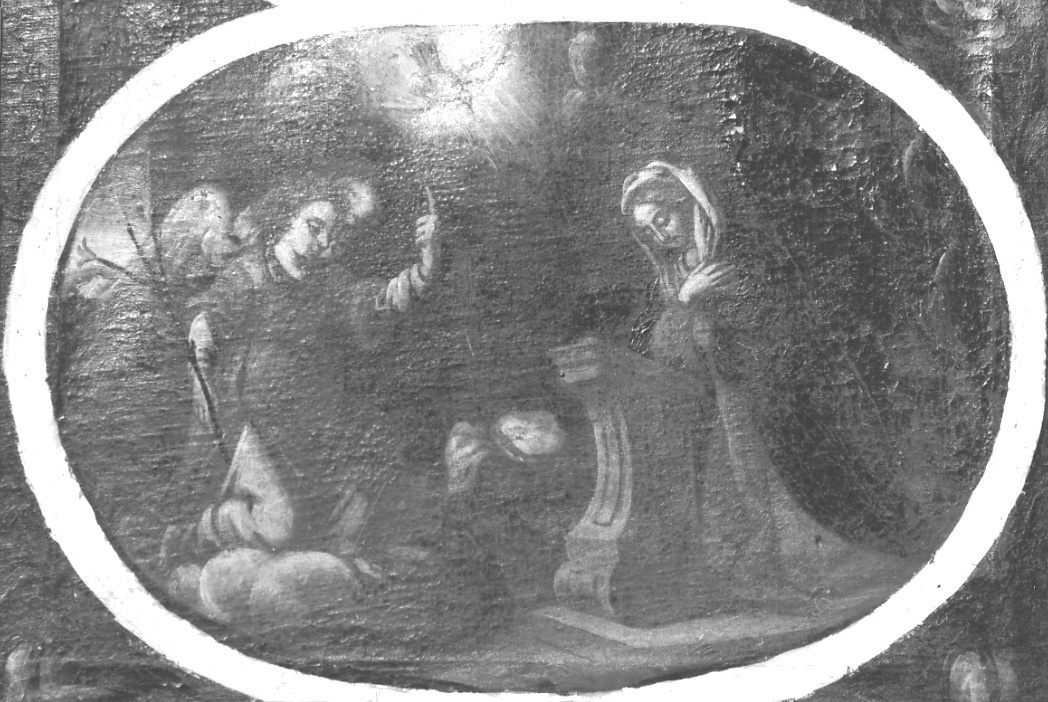 Personaggi: Maria Vergine; Arcangelo Gabriele. Attributi: (Arcangelo Gabriele) giglio. Abbigliamento. Simboli: colomba (Spirito Santo). Interno. Mobilia: leggio