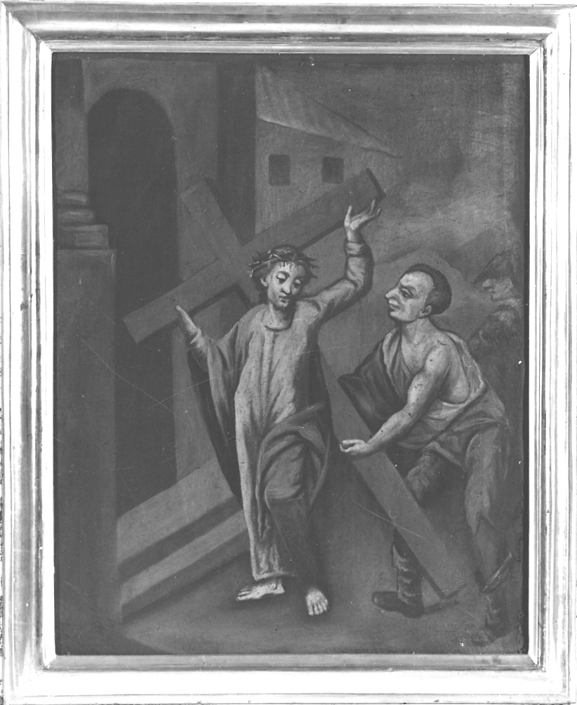 Personaggi: Gesù Cristo; Cireneo. Figure: carnefici. Abbigliamento. Paesaggi: paesaggio con edifici