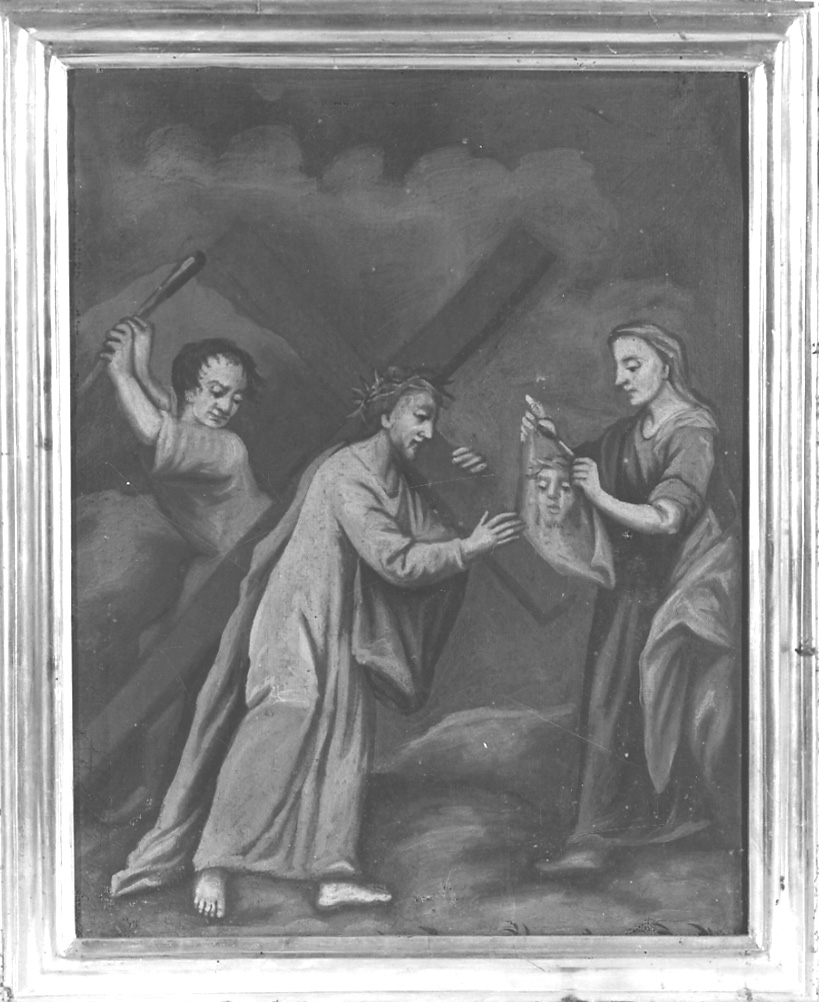 Personaggi: Gesù Cristo; Santa Veronica. Figure: carnefice. Abbigliamento. Paesaggi. Simboli della passione: velo della Veronica. Oggetti: bastone