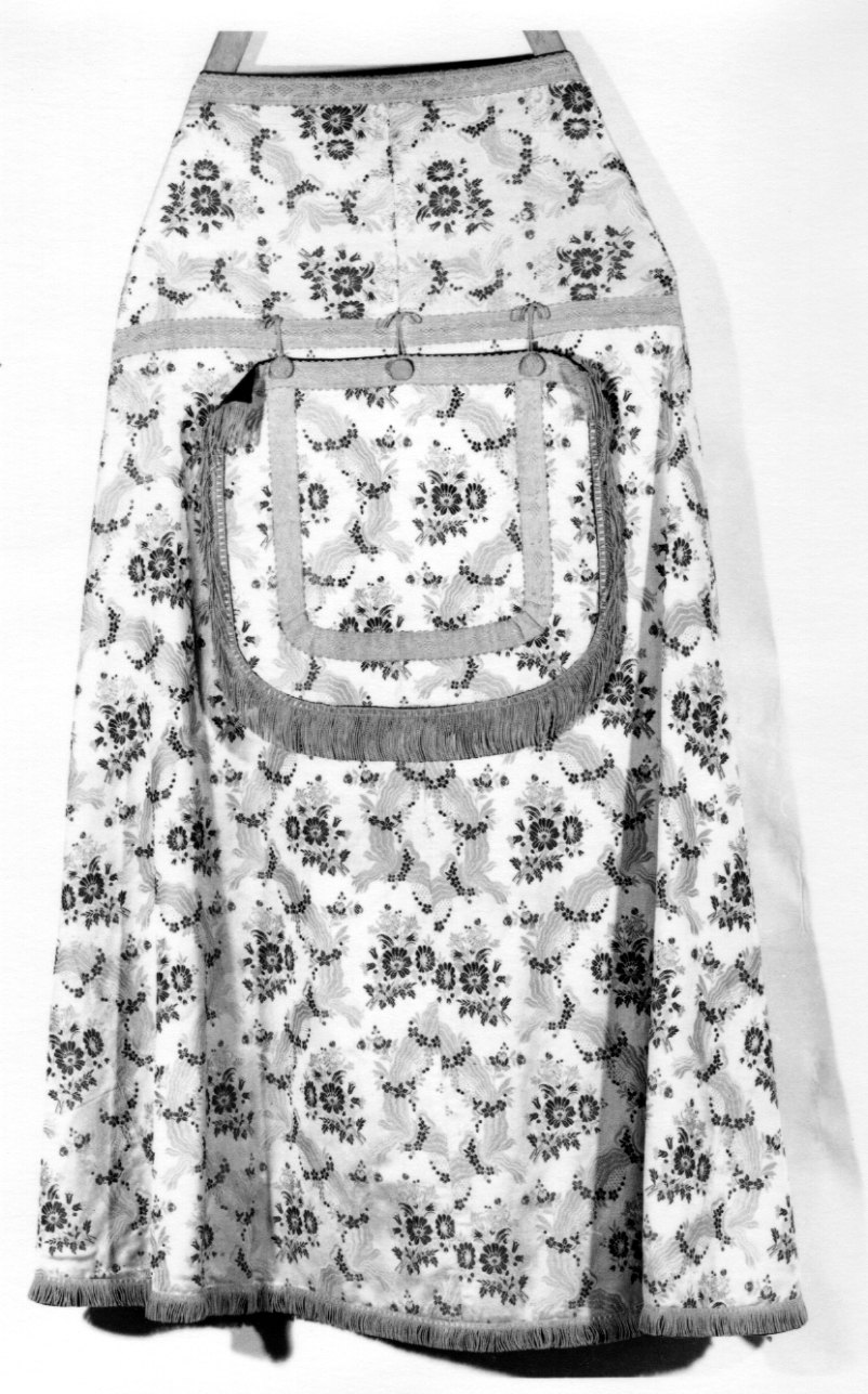 Il tessuto, sullo sfondo, è di colore grigio perla; l'opera è in giallo, rosa, verde e marrone. Il gallone è in giallo, mentre la fodera è di colore bordeaux