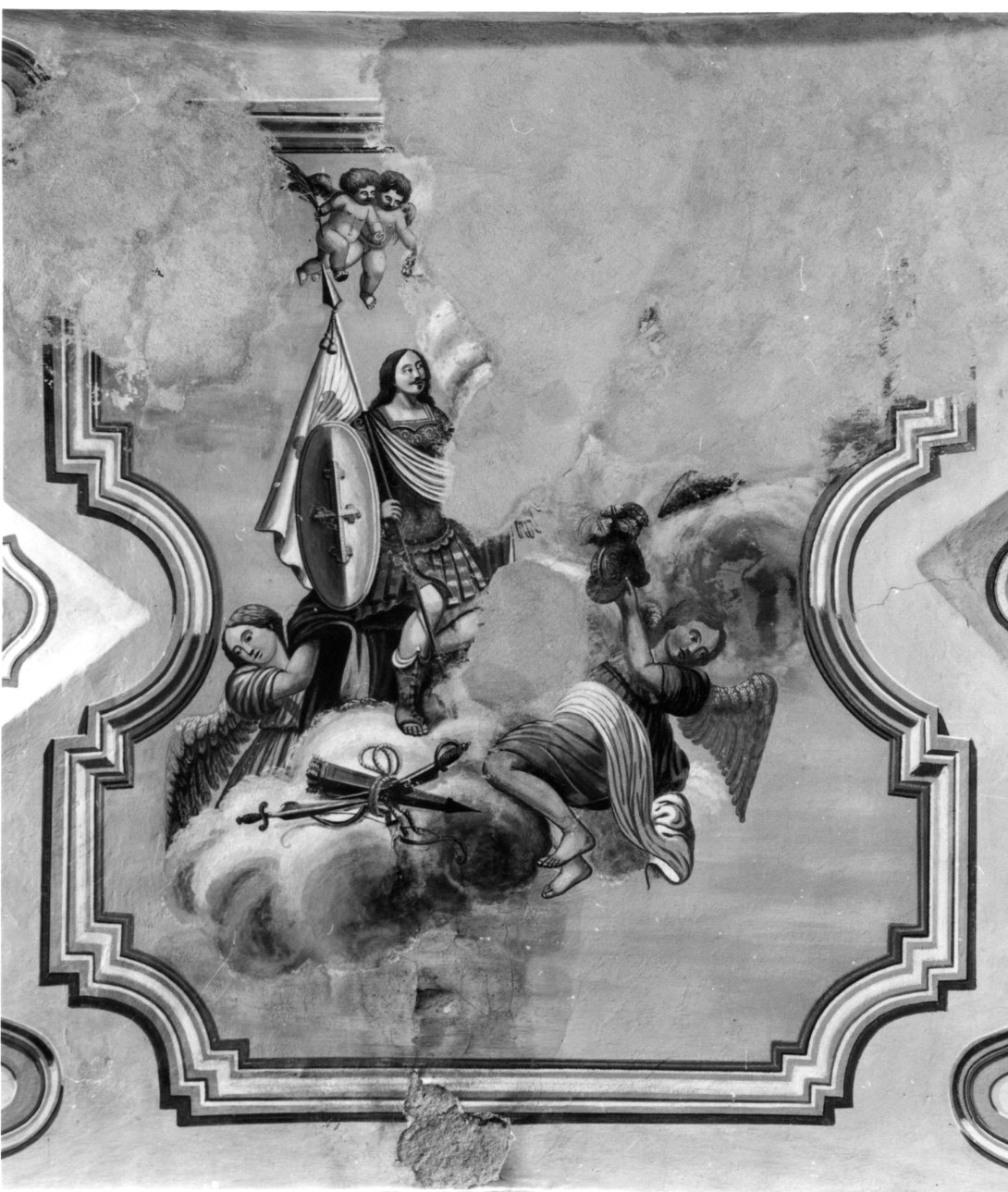 Soggetti sacri. Personaggi: San Maurizio. Attributi: (Maurizio) elmo; scudo; vessillo; spada; armatura. Figure: angeli. Abbigliamento. Simboli del martirio: palma. Fenomeni metereologici: nuvole