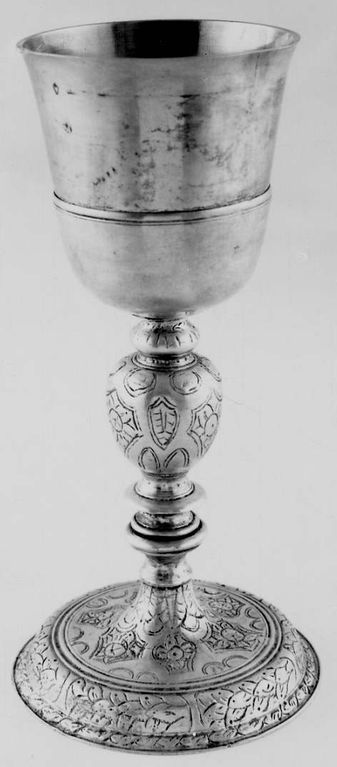 Calice con piede circolare sagomato, fusto a balaustro con nodo ovoidale; sottocoppa semisferico levigato; decorazioni a motivi vegetali stilizzati nel piede e nel nodo