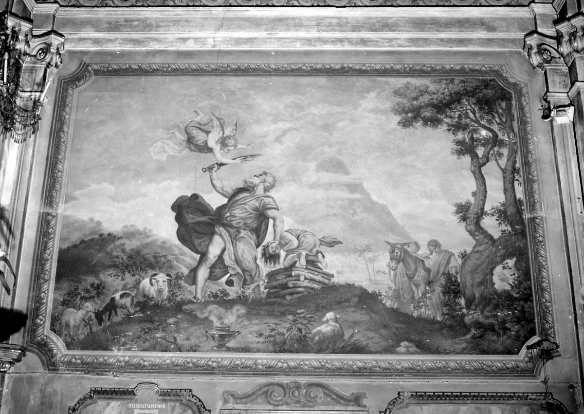 Soggetti sacri. Personaggi: Isacco; Abramo. Figure: angelo; figura maschile. Abbigliamento. Armi: coltello. Animali: ariete; pecore; asino. Oggetti: altare. Piante. Paesaggi: paesaggio montano