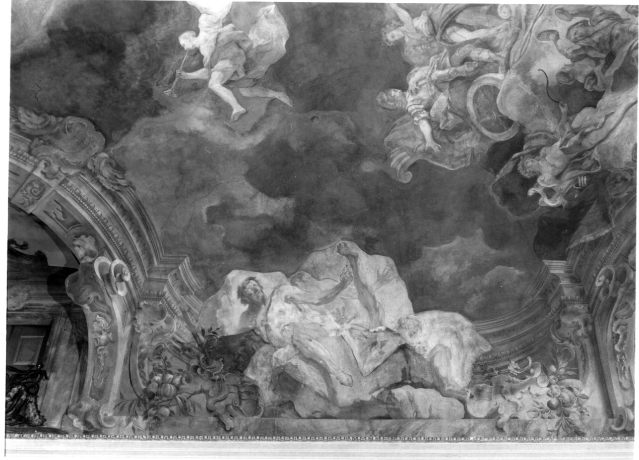 - NOTIZIE STORICO CRITICHE Già attribuito a Daniel Seyter, l'affresco riferito da A. Griseri e C. Mossetti al pittore veneto Mattia Bortoloni, attivo presso il santuario di Vicoforte (Caprara V., voce in Pittura in Italia. Il Settecento, a cura di Briganti G., 1990). Si deve, però, tenere conto che il Marchese Ottavio Falletti di Barolo nel suo testamento del 23 giugno 1747 incarica il suo erede universale (Carlo Girolamo Falletti) "di far dipingere il salone del suo palazzo, ove abita, da pittori milnaesi, co' quali ha già convenuto si, e come resta espresso nella minuta di scrittura..". Si ricorda infine che O. Derossi nella sua Nuova guida per la città di Torino, 1781, tra i pittori attivi nel palazzo del Marchese di Barolo cita oltre a Bortoloni anche Felice Biella (1702-1786), suo collaboratore nell'affresco della cupola del santuario di Vicoforte (1742-1752), e Pontojn, forse il milanese Carlo Giuseppe Pontoja, uno dei pochi allievi del Bortoloni.Con la lettera del 9 gennaio 1911 l'Opera Pia Barolo incarica il pittore decoratore Luigi Mocchiolo di Torino "della pulitura e lavatura e restauro del dipinto a fresco nel volto del gran salone", da terminarsi entro il mese di gennaio, per un compenso di L. 500. Al 12 gennaio 1938 risale un preventivo di Carlo Pintor per il restauro del soffitto del salone. A seguito dell'incursione aerea del dicembre 1942 risulta una lesione alla volta del salone, con scrostamento degli affreschi