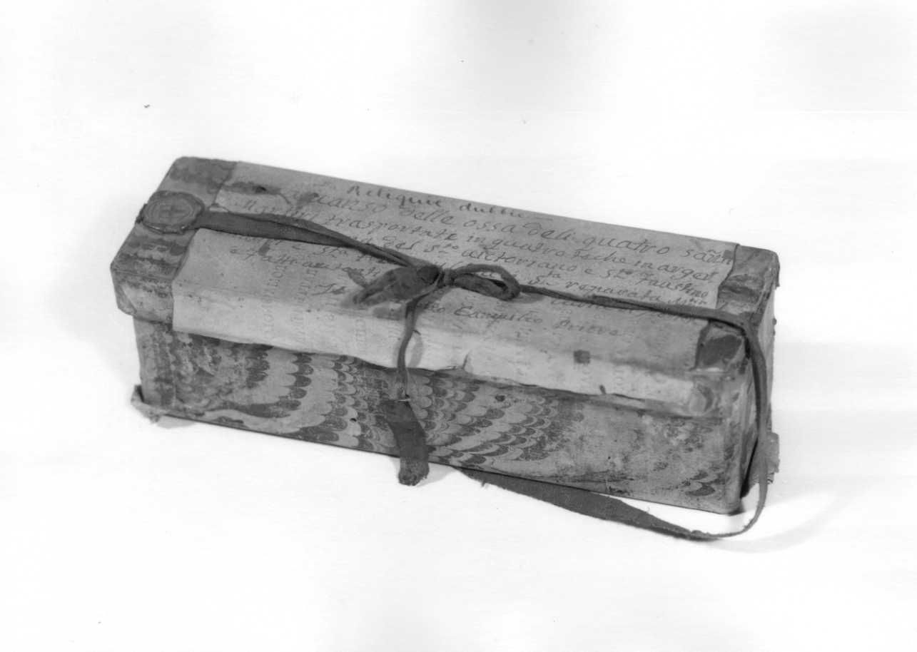 Scatola rettangolare con coperchio legato da un nastro fissato con sigilli in ceralacca, di cui uno integro, con lo stemma della Curia vescovile di Tortona. Sul coperchio è stato incollato un foglio sul quale è descritto il contenuto della scatola