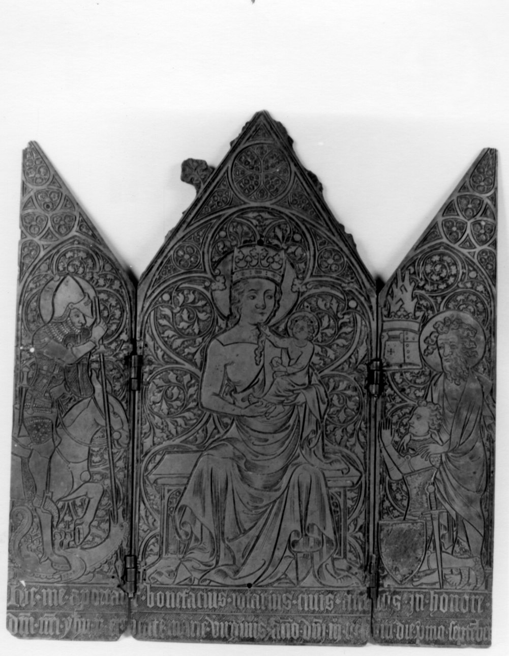 Trittico in bronzo, inciso a bulino; composto da tre parti terminanti a cuspide (una centrale maggiore e due più piccole, laterali), unite da cerniere, in modo tale da essere chiuso e trasportato. Nella parte centrale è raffigurata la Vergine seduta su un trono a cassapanca con in braccio il Bambino, che in mano regge il globo terrestre, e con l'altra accarezza il seno della madre; sul'anta di sinistra, è rappresentato San Giorgio a cavallo, in armatura, colto nel'atto di trafiggere il drago con la lancia, mentre su quella di destra un santo con la barba (probabilmente San Giovanni Battista) con le mani posate sulle spalle del committente inginocchiato, Bonifacio Rotario. Al di sopra delle figure, esili arcate gotiche, tra le quali si dispongono motivi ornamentali di sfondo. Nella parte inferiore, corre la fascia con l'iscrizione