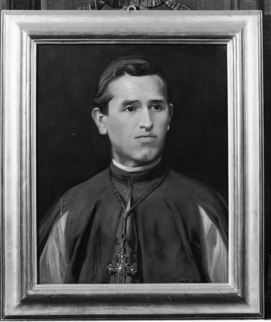 Il vescovo è ritratto frontalmente, col volto di tre quarti, con croce sul petto