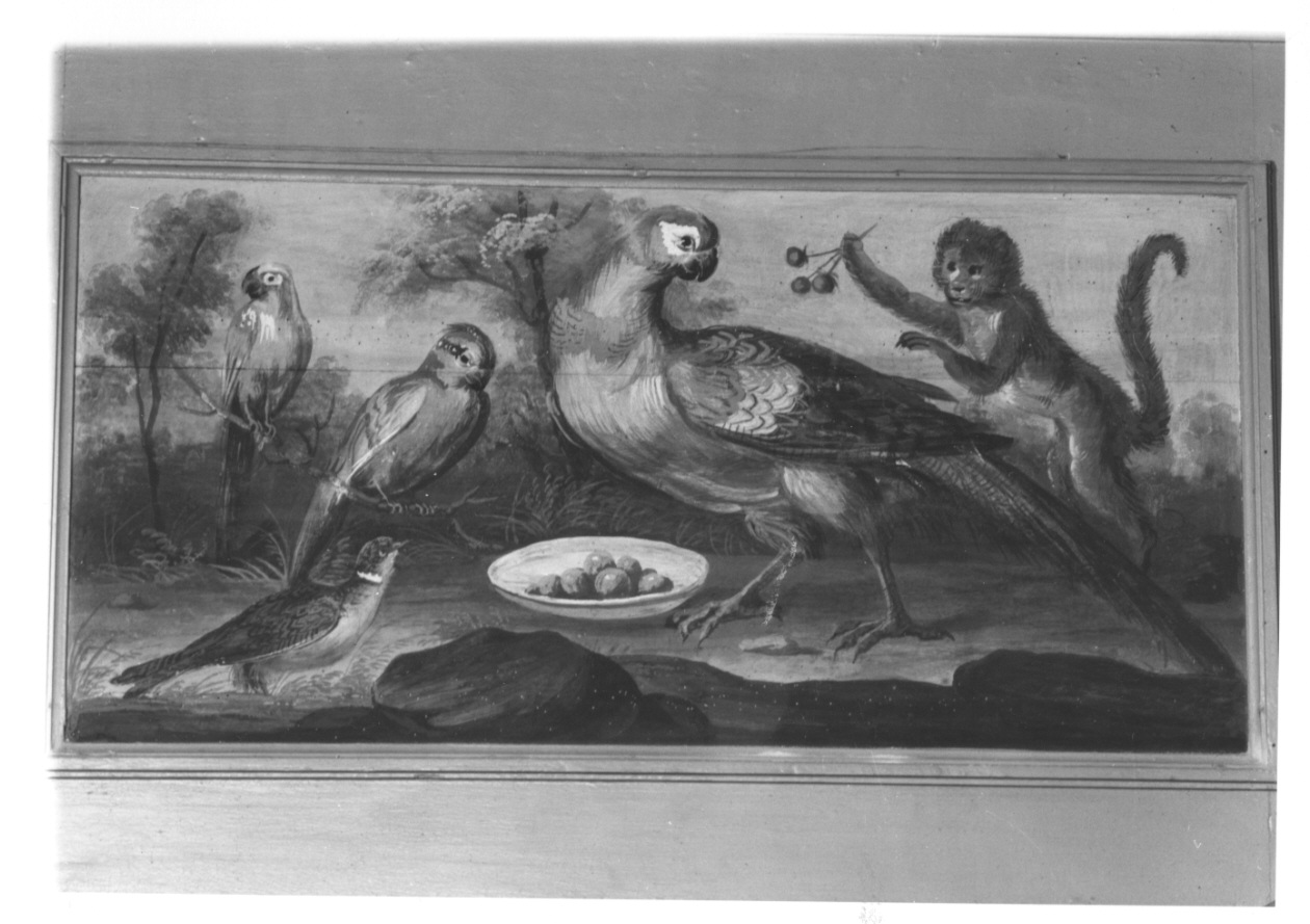 Sovrapporta costituita da pannello ligneo, formato da tre tavole, dipinte a tempera. La composizione è dominata da un paesaggio, ricco di vegetazione, in cui si inseriscono gli animali: un pappagallo, appollaiato sopra ad un ramo, due uccelli, un fagiano e, all'estrema destra, una scimmia, colta nell'atto di porgere delle ciliege al fagiano. Davanti agli animali, per terra, è appoggiato un piatto
