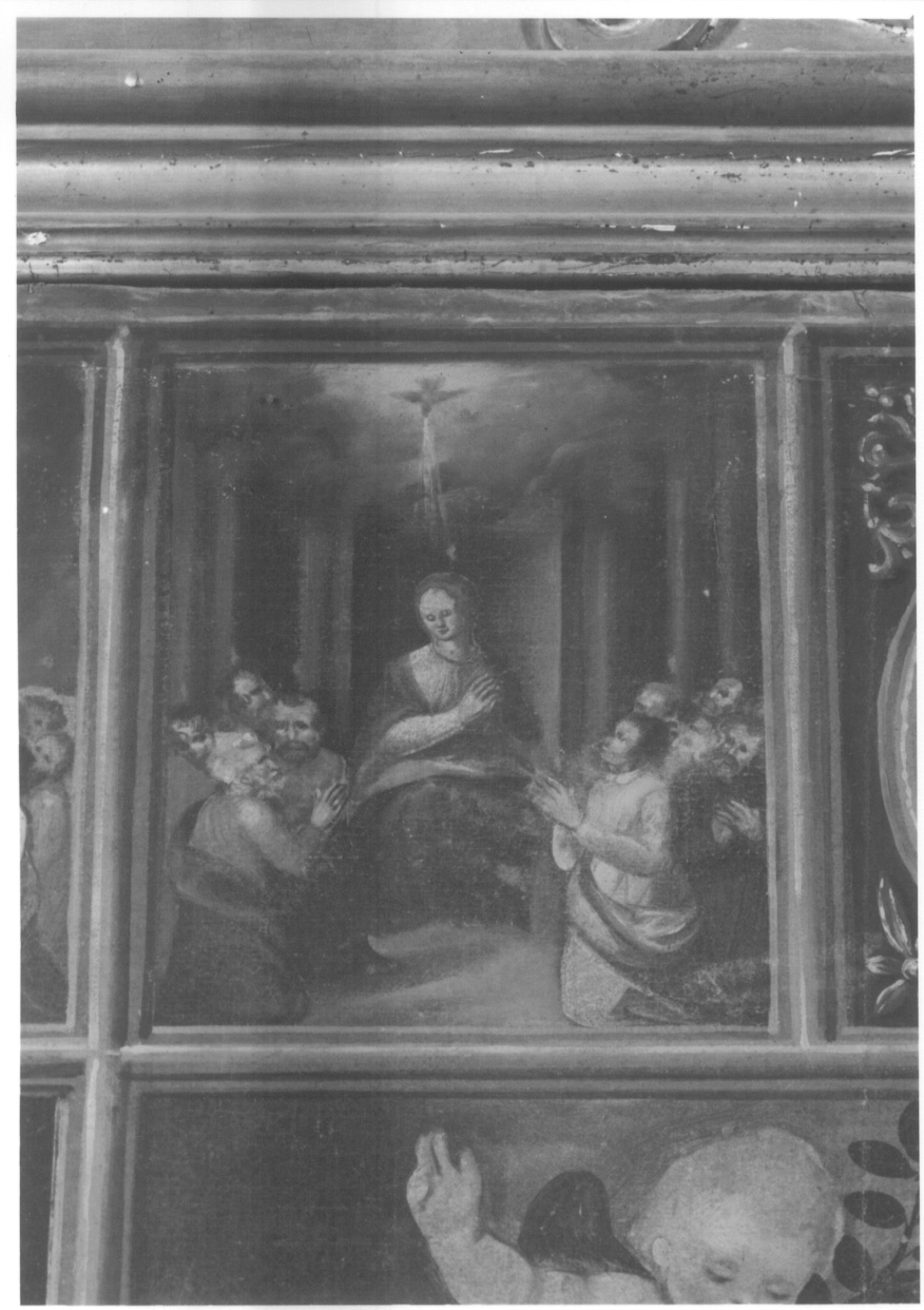 Soggetti sacri. Personaggi: Madonna. Figure: apostoli. Simboli: (Spirito Santo) colomba. Fenomeni divini: luce soprannaturale. Abbigliamento