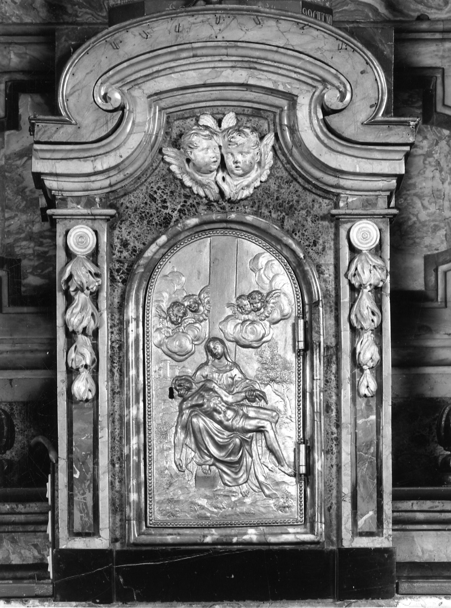Tabernacolo omogeneo all'altare. Sculture apposte: in alto cherubini, ai lati serti fogliati. Sopra la cornice superiore è inserita una cornice in legno sagomato con ganci per appendere. Patina in metallo stampato dorato (moderna), raffigurante la "Pietà"