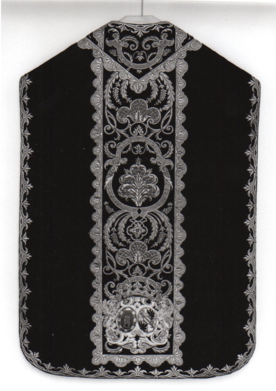 Paramento composto da:6 pianete;2 dalmatiche; 6 piviali;5 stole;1 parato per altare;1 borsa per corporale, in velluto color porpora ricamato con filo dorato (imbottitura in carta), è foderato in taffetas giallo. Pianete, dalmatiche e piviali recano, ad applicazione su imbottitura in panno, uno stemma ricamato su gros de Tour laminato argento e gros di Tour rosa laminato oro, anche dipinto. Le dalmatiche hanno cordoni in seta e filato metallico terminanti in nappe con anima lignea. Parato: striscia composta da 14 elementi trapezoidali, ognuno ricamato con croce al centro e motivo decorativo dorato lungo il perimetro. Gli elementi hanno fodera in tela-taffetas giallo. Lungo il lato superiore è applicato, sul retro, del velcro. Le estremità brevi sono rifinite con gallone eseguito a telaio con filo di seta gialla e filo argentato. Borsa per corporale: in velluto rosso ricamato con filo dorato: grande croce raggiata al centro, bordo con gruppi (cfr. OSS)