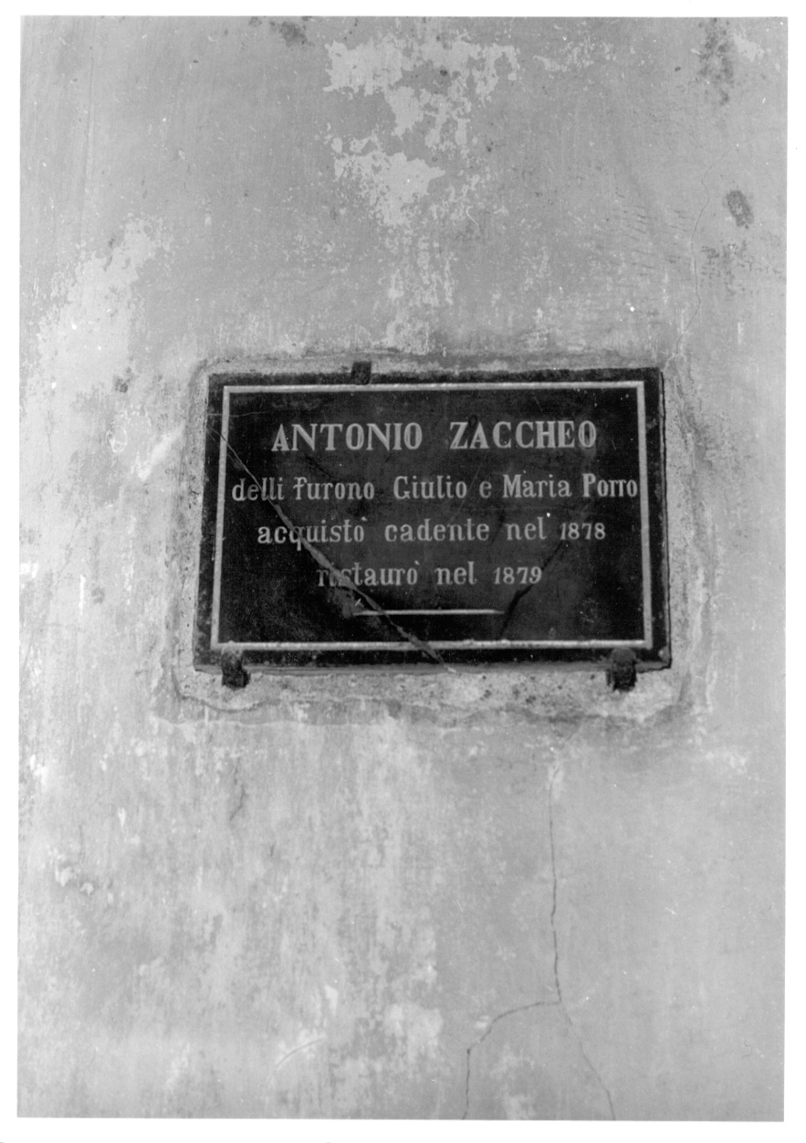 - ISCRIZIONI al centro - ANTONIO ZACCHEO/ delli furono Giulio e Maria Porro/ acquistò cadente nel 1878/ restaurò nel 1879 - lettere capitali -