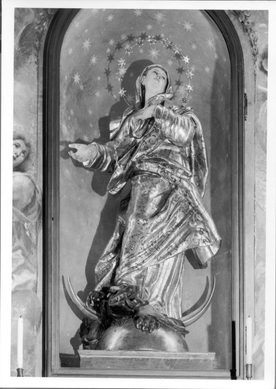 - NOTIZIE STORICO CRITICHE La statua fu collocata sull'altare dell'Immacolata Concezione dopo il 1783, con le elemosine di alcuni benefattori di Orta. Tale scultura, posta entro una nicchia protetta dal vetro, andava a sostuire una preesistente di formato minore, ivi sistemata prima della metà del 700. Dalla documentazione della parrocchia non emerge il nome dell'artefice dell'immagine, poi corredata nel 1888 di una corona di stelle e nel 1889 ridorata dall'indoratore Rovetta Gaudenzio, come si legge dentro lo scavo della figura. La scultura rivela l'adesione al linguaggio rococò milanese che in quella città aveva avuto il suo laboratorio nel cantiere della Fabbrica del Duomo. Proprio da qui erano usciti gli esponenti più significativi della scultura attivi in Lombardia e anche nel novarese, tra i quali Elia Vincenzo Buzzi, morto nel 1780. I caratteri della statua in esame, richiamano abbastanza da vicino il linguaggio del citato Buzzi, nel suo vivo dinamismo, se pur nella convenzionalità della figura nell'atteggiarsi devoto, con la mano sinistra sul petto e l'altra protesa verso lo spettatore e nella rigidezza degli intagli. Il particolare più significativo del gruppo è il piccolo mostro ai piedi della Madonna, un motivo questo appartenente all'iconografia del soggetto, che nel territorio novarese aveva avuto un esempio particolarmente significativo nella chiesa di san Francesco a Trecate: il gruppo dell'Immacolata realizzato nel 1713 e riconducibile piuttosto alla bottega di Giuseppe Antignati, seguiva nel combinarsi di drago luna e sfera una tipologia che sarebbe poi stata pienamente seguita dallo scultore attivo per Orta. Pur non essendo possibile formulare un nome preciso per la statua in esame, si possono proporre alcuni confronti con la Madonna del Rosario della parrocchiale di Grignasco, in base ai documenti attribuibile allo scultore Giuseppe Mazzola, già attivo ad Orta in questa stessa chiesa per il Crocifisso nella cappella del S.mo Sacramento. Manchiamo di dati che lo riguardino, e non conosciamo altre opere di sua esecuzione fuori di queste ora citate, tuttavia non sfugge la sua modalità di intaglio rigida, non lontana da quella attuata dallo scultore dell'immagine ortese. La statua ancora oggi è portata in processione durante la sua festa, l'8 dicembre
