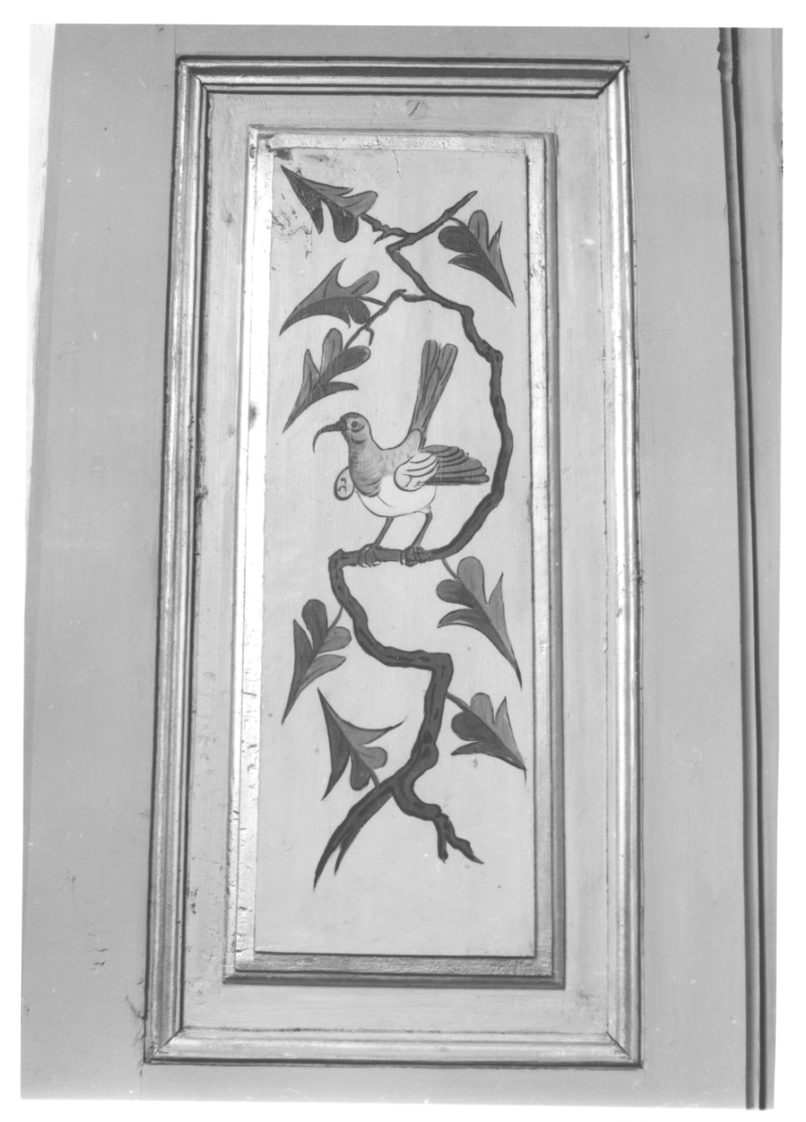 Pannello di scuro di finestra dipinto a motivi decorativi vegetali e uccelli di gusto orientaleggiante