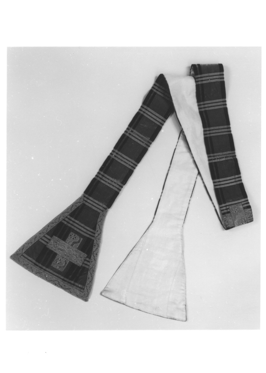 La stola è realizzata con quattro frammenti di velluto e con 5 frammenti di fodera. I bordi delle alette sono rifiniti col gallone più sottile, mentre quello più spesso è impiegato per confezionare le tre croci, due dele quali sono poste sulle alette, mentre la terza al centro del troncone
