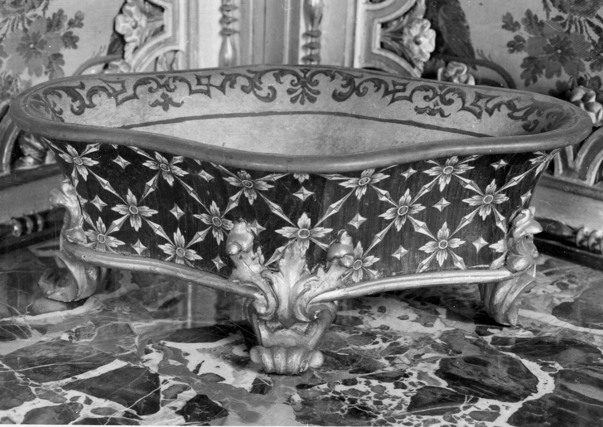 Sputacchiera in legno intagliato, dorato e intarsiato in avorio