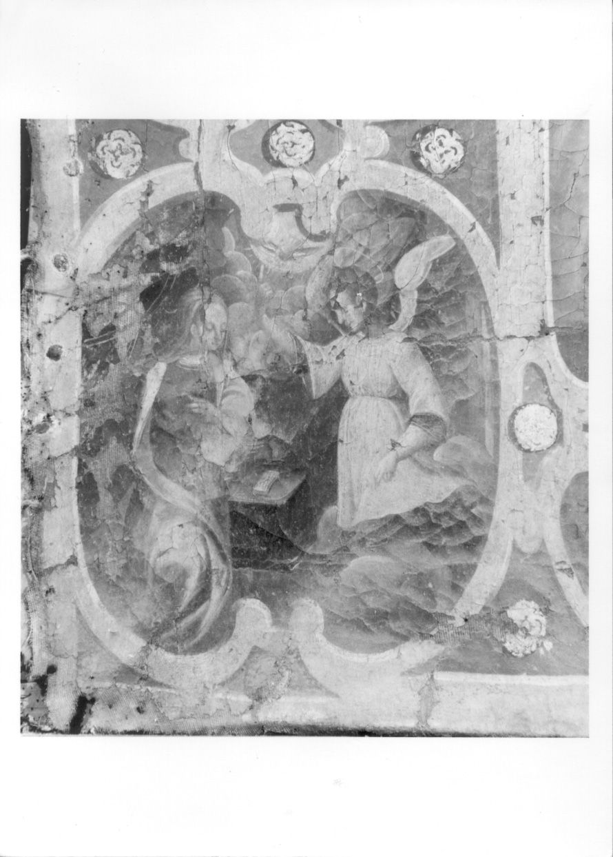 Dipinto con colori modulati in toni grigi e ocra nello sfondo e sui quali ha particolare risalto il rosso acceso dell'abito della Vergine
