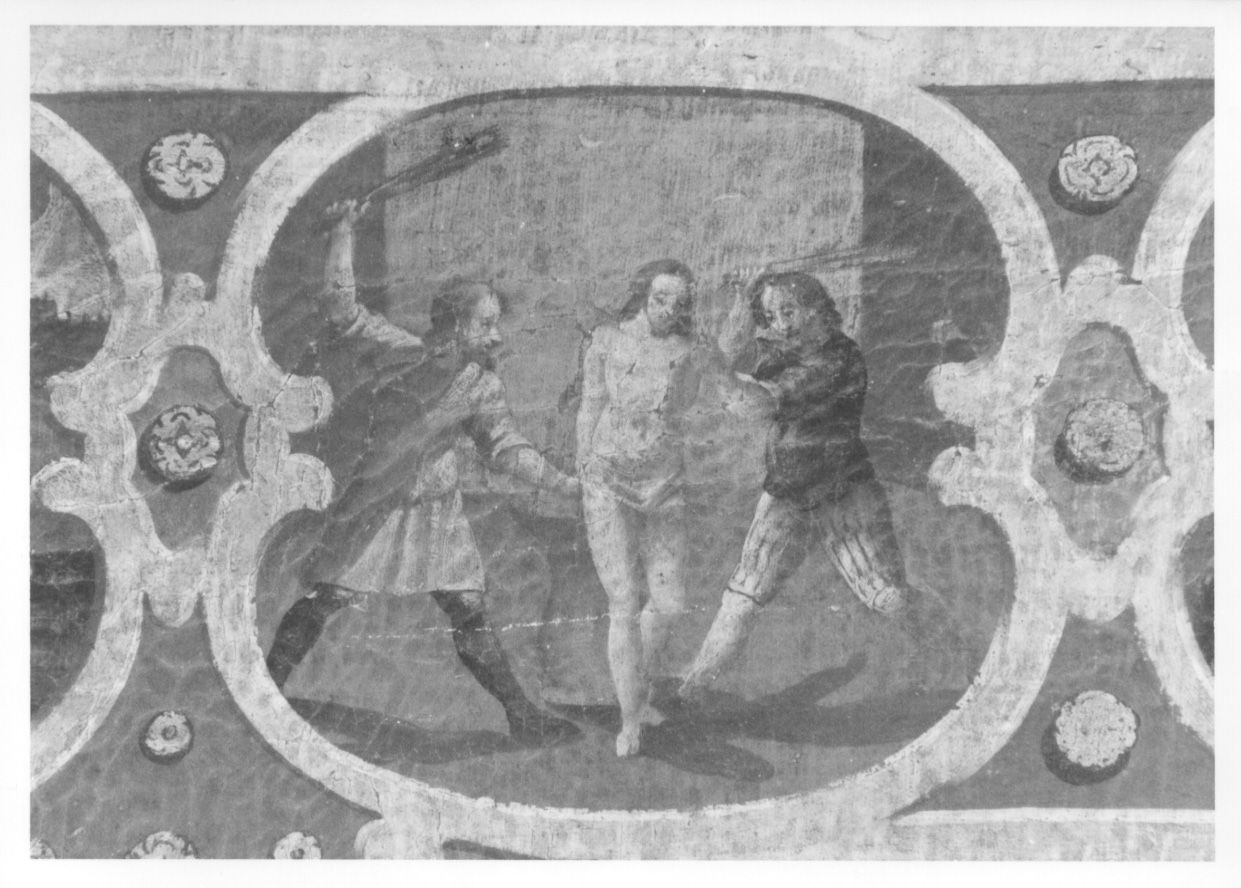 Dipinto con sfondo delineato da tonalità ocra e sul quale si stagliano le figure evidenziate sia dal chiaroscuro che dal bruno, dal rosso e dall'azzurro di alcune parti dell'abbigliamento