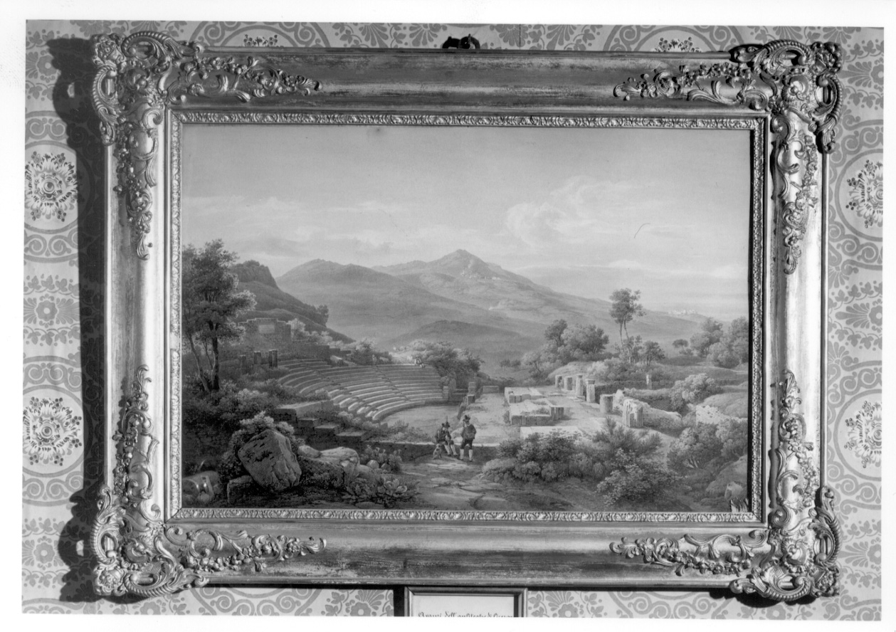 Dipinto entro cornice lignea intagliata e dorata con ampi decori agli angoli, da cui pende una cornicetta dorata con iscrizione a penna "Avanzi dell'anfiteatro di di Cicerone/ alla Villa Tusculana in Roma". Rappresenta un paesaggio con colline, allberi ed un teatro antico, ai margini del quale si trovano due figure maschili abbigliati da cacciatori