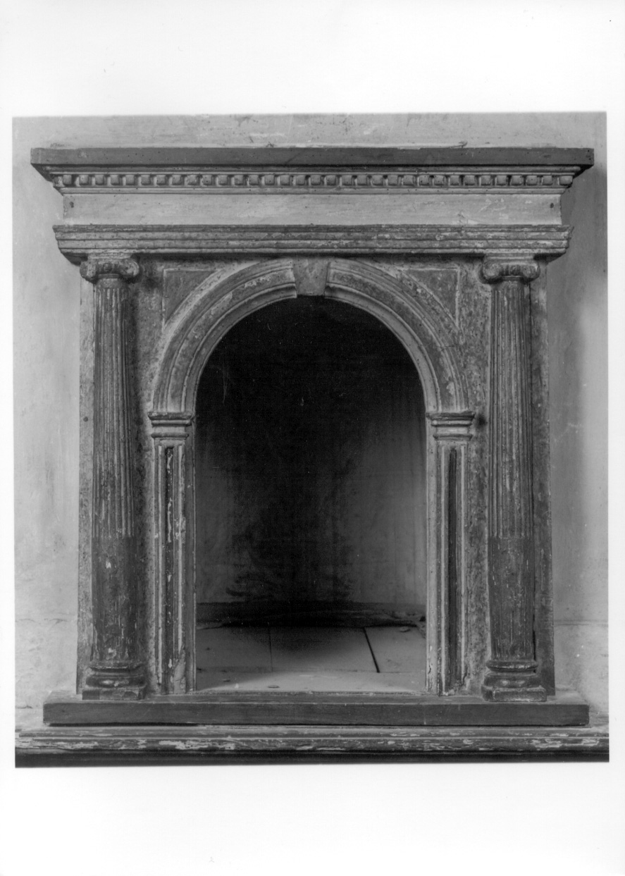 Una coppia di lesene scanalate terminanti in capitelli ionici è posta a sorreggere un architrave decorato a dentelli sul fronte. Soltanto i capitelli ionici e le due mensole d'imposta dell'arco centrale presentano labili tracce dell'antica doratura, mentre le due semicolonne scanalate si presentano di un colore rosso-bruno (forse il bolo di preparazione di una doratura perduta). La trabeazione a dentelli è di colore bianco, mentre è dipinta di una lieve tonalità di verde la trabeazione modanata sorretta dalle semicolonne. Questa, presenta una decorazione incisa che vede alternarsi in sequenza motivi geometrici ovali e rettangolari. Una pittua a finto marmo ricopre il fondo del fronte architettonico. Un'arcata a pieno sesto con chiave di volta costituita da un concio sporgente sormonta lo sportello centinato