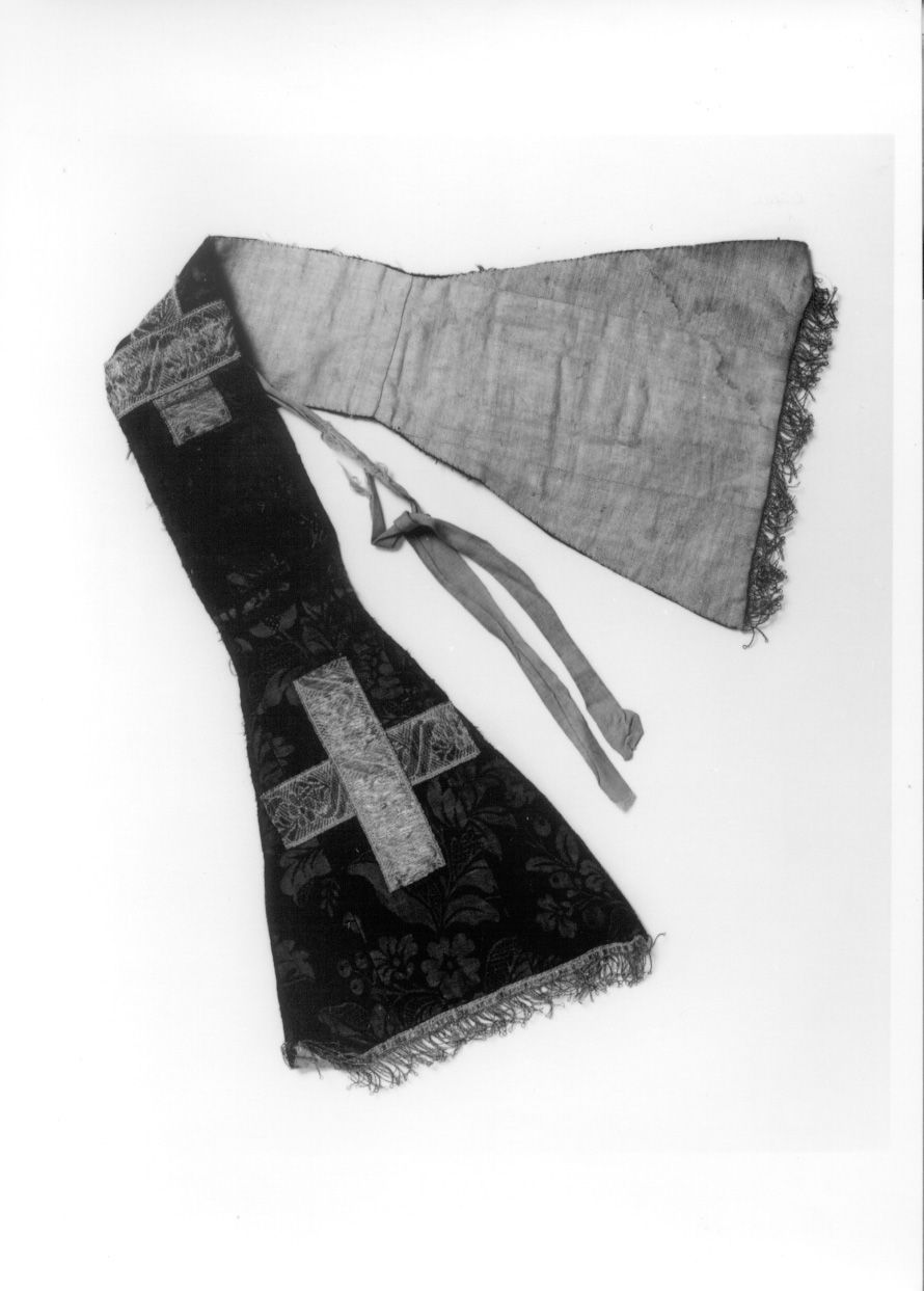 - NOTIZIE STORICO CRITICHE Il tessuto presenta un disegno tipico del terzo quarto del Settecento, il "meandro", ma una certa pesantezza nel disegno e nella composizione porterebbero a datare il lampasso nel secolo successivo, Soprattutto nella seconda metà del secolo, in particolar modo per l'arredo e l'abbigliamento ecclesiastico, le manifatture riproponevano la tecnica e gli ornati dei tessuti più antichi. Fra le molteplici testimonianze di questo "revival" si possono menzionare il paramento in gros de Tours liseré broccato datato alla seconda metà dell'Ottocento e conservato presso il Monastero della visitazione di Arona (D. DEVOTI e G. ROMANO (a cura di), Tessuti antichi nelle chiese di Arona, catalogo della mostra, Torino 1981, pp. 212-214, scheda n. 27 di M. Cuoghi Costantini), la pianeta del quarto decennio del XIX secolo, in Gros de Tours liseré broccato, del Museo Diocesano Tridentino (D. DEVOTI, D. DIGILIO, D. PRIMERANO (a cura di), Vesti liturgiche e frammenti tessili nella raccolta del Museo Diocesano Tridentino, Trento 1999, pp. 164-165, scheda n. 114 di D. Digilio), con il parato, di ambito francese e datato al 1770-1780, di Santa Ma (a cura di), pp. 145-146, scheda n. 93 di D. Digilio), il parato del secondo quarto dell'Ottocento della Cappella Palatina a Palazzo Pitti (R. ORSI LANDINI, I paramenti sacri della Cappella Palatina di Palazzo Pitti, Firenze 1988, p. 146, scheda n. 80) e le colonne, in taffetas doublé liseré broccato della seconda metà del XIX secolo, del servizio liturgico della Chiesa della Madonna del Ponte a Susa (Forme e colori per il servizio divino, 1997, pp. 106-107, scheda n. 20 e pp. 146-147, scheda n. 41 di M. P. Ruffino)