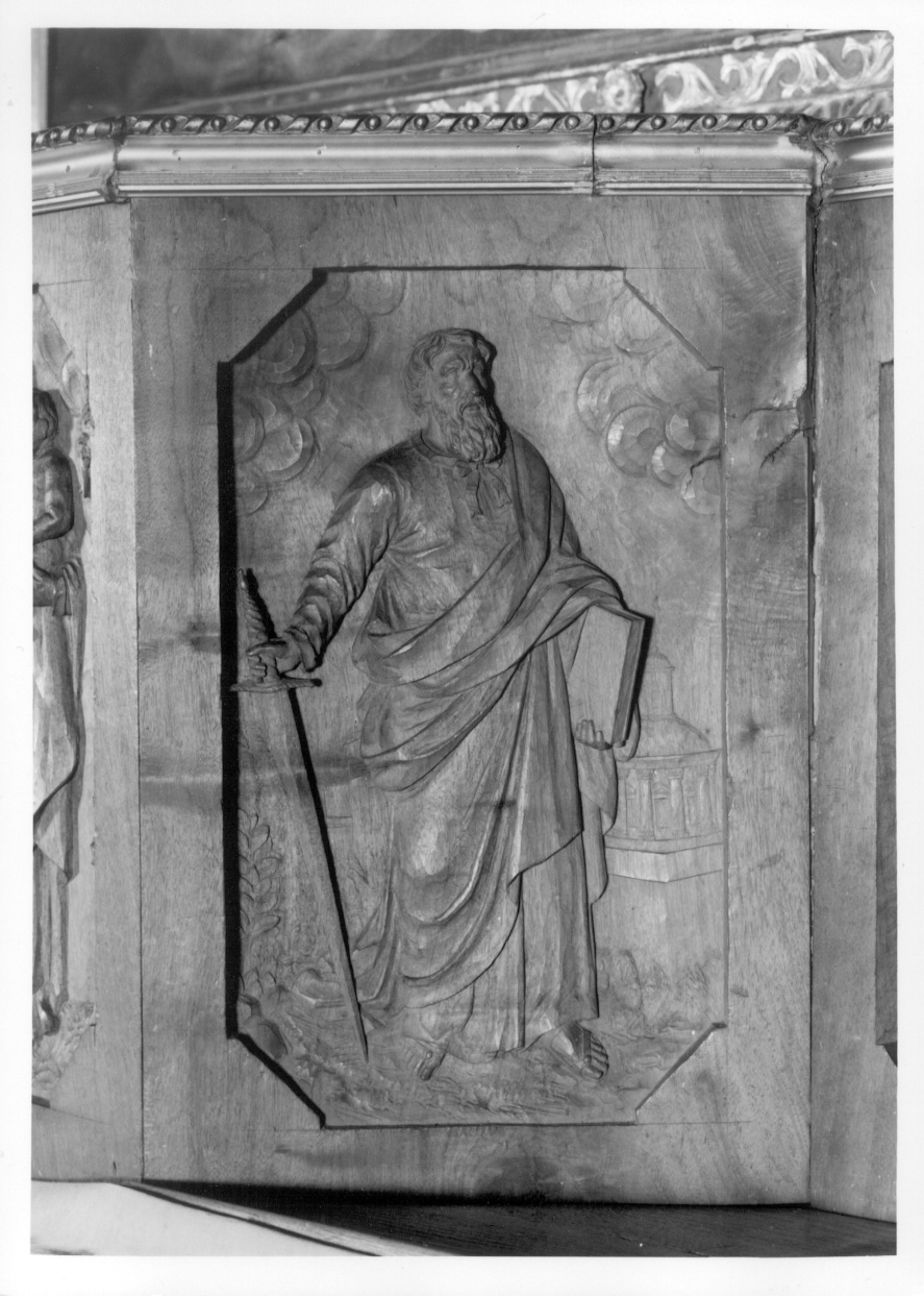 Formella ottagonale a lati ineguali; il santo in piedi, reggente con la destra la spada e con la sinistra il libro; un tempio a pianta centrale sullo sfondo