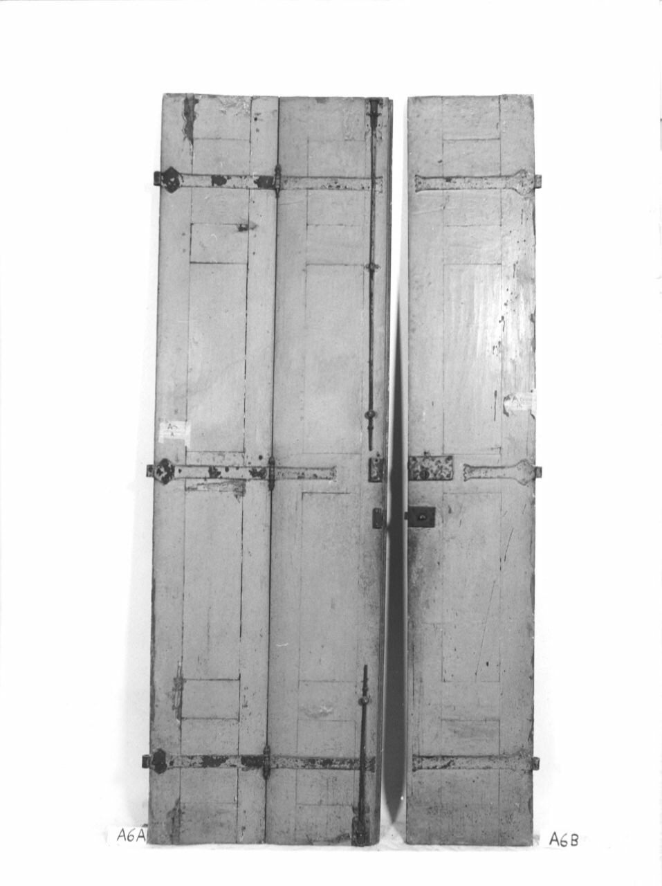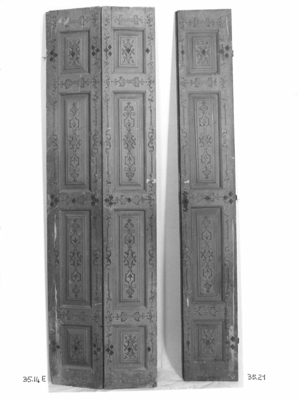 Porte a due battenti, uno dei quali composto da due ante a soffietto, decorate da quattro specchiature rettangolari, ed uno da un'anta. Tutta la superficie è decorata da motivi decorativi dipinti a grottesca. Le serrature sembrano originarie, come le borchie metalliche a forma di losanga