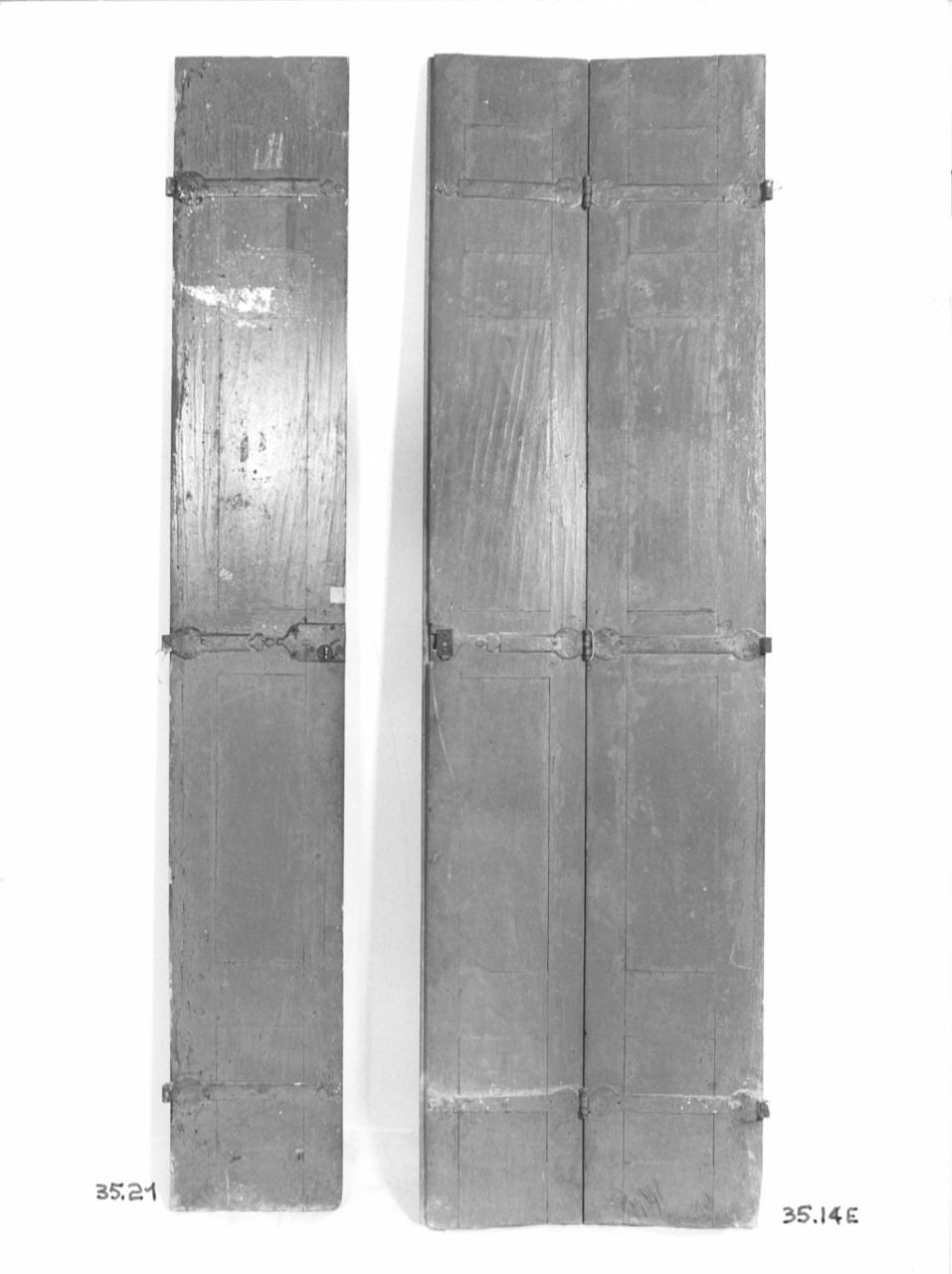 - NOTIZIE STORICO CRITICHE Le due porte sono incernierate ai cardini posti nell'apertura tra l'anticappella (n. 38) e il vano scala A (quella identificata dai numeri d'inventario A6A-A6B o A5) e tra il vano scala e la stanza n. 35 (Anticamera verso levante dell'Appartamento di S.M. la Regina), quest'ultima contrassegnata con i n.i 35.14E-35.21 o A2