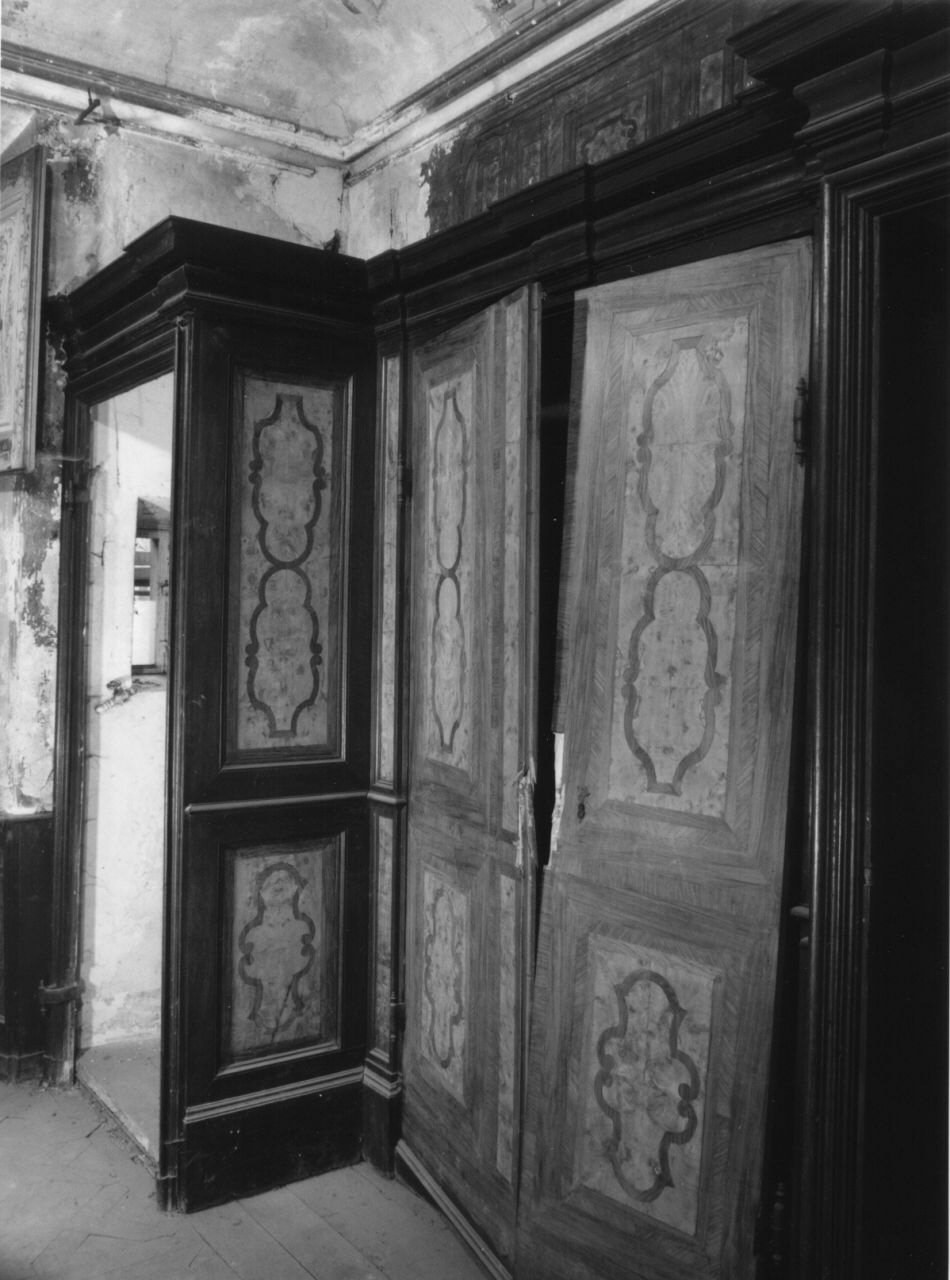 - NOTIZIE STORICO CRITICHE Gli armadi che rivestono le pareti del "Gabinetto della Guardaroba" nell'Appartamento di S. M. la Regina sono documentati a partire dall"Inventaro de mobili, ed altri oggetti esistenti nel Palazzo della Vigna di S. M." (Torino, Biblioteca Reale - sc. 45) compilato nel 1755: "Due Guardarobbe di noce lavorate e ferrate che investono le muraglie"; la stessa descrizione è riportata nell'inventario del 1767 mentre i primi inventari ottocenteschi (1812 -1819) registrano rispettivamente nel "Cabinet Contigu" o "Guardarobba" "Deux Corps d'Armoires de Noyer Plaqués qui Entoure le Cabinet, et doublés de Toilenella" e un "circuito di guardarobbe a placaggi, a diverse portelle". Più dettagliate sono le descrizioni degli arredi del "Gabinetto prospiciente a giorno" riportate nella successiva ricognizione compilata nel 1845 dal Consierge Felice Boozoky (Inventario di tutti li mobili, oggetti di addobbamento ed altri diversi di Regia Spettanza esistenti nel Palazzo della Vigna Reale detta della Regina e nelli fabbricati dipendenti, posti sotto la custodia del Concierge sig. Felice Boozoky, ASTO, Corte, Archivi Privati, Castelli Berroni - m. 19): "Un Corpo di guardaroba impiallacciato di legno noce con guardaroba al centro a due sportelli chiusi a serratura a chiave foderata di tela bianca ed avente tre piani d'Assi ed un portamantello a carriglie (?) fiancheggiata la medesima da due porte volanti e da un pezzo di boesaggio [...] Un altro corpo di Guardaroba uniforme al suddescritto avente però al centro un armadio in due ordini chiusi a due sportelli con serratura e chiavi, avente quello inferiore un piano d'asse, e due quello superiore fiancheggiato pure da due porti volanti una per armadio con tre piani interni e l'altra all'uscita. N. B. Questi armadi sono pure foderati di tela" e nei "Testimoniali di Stato della Vigna della Regina ed annesso Palazzo Chiablese" (ASTO, Corte, Istituti Assistenza e Beneficenza - cat. 11, m. 653) compilati nel 1864: "Nelle pareti di levante e ponente corpi di Guardaroba in legno forte divisi nel prospetto in tre parti di portine a panelli impiallacciati di legno pero conterminati da una cornice con piani interni e fodera, rivestiti di tela. Le parti di Guardaroba verso il N. 5 servono eziandio d'accesso all'occorrenza alli n. 6 e 8".L'armadio della parete ovest è costituito da un unico corpo, chiuso da due ante ancora esistenti (corrispondenti ai nn. 19W e 20W), all'interno del quale trovano posto tre ripiani e l'appendiabiti n. 21W. Era affiancato da due porte volanti ora mancanti. A est l'armadio è invece suddiviso in due corpi entrambi chiusi da due sportelli intarsiati. Anche questo era affiancato da due porte volanti, una, verso la parete sud, a chiusura di un armadio a tre ripiani, poi adibito a locale lavandino in tardo Ottocento, e una a nord che dava accesso alla scala. La struttura degli armadi e di tutta la boiserie è in legno di noce con intarsi in radica di olmo. Nel 1942 Eugenio Olivero ricorda l'esistenza di disegni "del Baroni (q. 1-79) al foglio 19 sono disegnate queste guardarobe e la seggetta, mobiletto barocco a gambe sinnose; rara rappresentazione di tale apparecchio dell'epoca"; infatti le "lignee guardarobe a sobrii pannelli settecenteschi" collocate nelle pareti est ed ovest della stanza, contenevano in appositi scomparti "una o due seggette; ora vi rimane un apparecchio sanitario moderno" (E. Olivero, 1942, p. 24). Alcune parti risultano rifatte, come ad esempio l'unica porta volante ancora presente nella parete ovest (n. 24W), con struttura in legno di pioppo ed intarsi in radica di olmo e frassino e il pannello di boiserie a sinistra della porta d'ingresso eseguito in legno compensato, impiallacciato e quindi intarsiato ad imitazione degli originali (n. 28N). E' interessante ricordare che il 18 dicembre 1812 il minusiere Giovanni Bertolo è pagato 424 franchi per la fattura di quattro guardarobe di noce unite "qui forment une seule, ayant huit battans tous assémbles et cornichés, huit tiroirs, tablettes, et une grande corniche au dessus de noyer, toutes dument ferrées puis placées) (ASTO, Governo Francese, mazzo 186).L'inventario del 1931 segnala sia in questo gabinetto che in quello ora indicato con il numero 26 la presenza di "bellissime cornici in legno scolpito" che "circondano tutti e due i gabinetti", da identificare probabilmente con il fregio ligneo ancora esistente nel locale 26 ma sostituito da una fascia dipinta in marrone con scomparti rettangolari e quadrati a specchiature sagomate nel gabinetto 34, frutto, probabilmente, degli interventi di ripristino degli anni Sessanta del Novecento