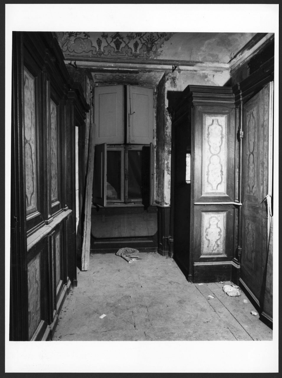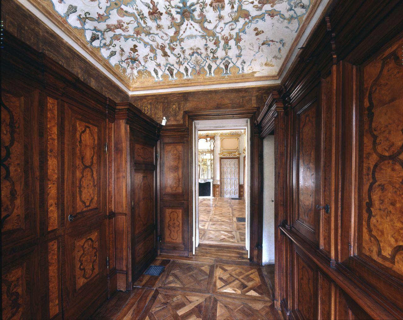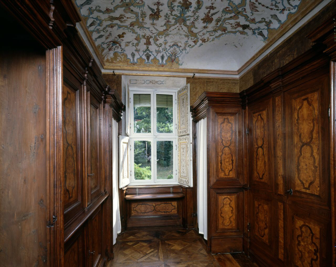 Il rivestimento da parete comprende due armadi -guardaroba composti da pannelli con specchiature mistilinee ornate ad intarsio, una porta volante a due riquadri con decori simili sulla parete ovest e relativa cornice e ribalta incorporata al davanzale della finestra a sud