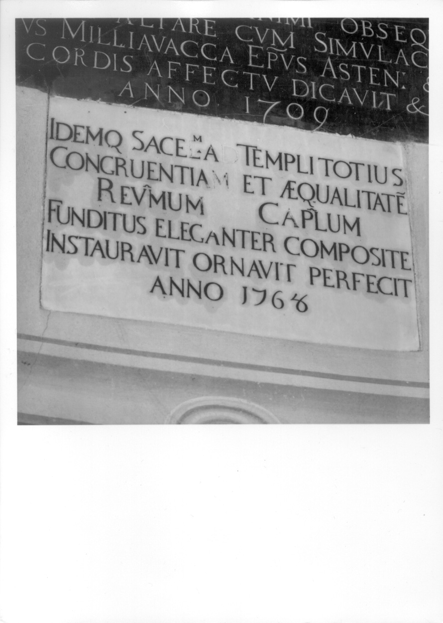 - ISCRIZIONI nel campo - IDEMQ SACEL.M AD TEMPLI TOTIUS / CONGRUENTIAM ET AEQUALITATE. / REV.MUM CAP.LUM / FUNDITUS ELEGANTER COMPOSITE / INSTAURAVIT ORNAVIT PERFECIT / ANNO 1768 - lettere capitali -