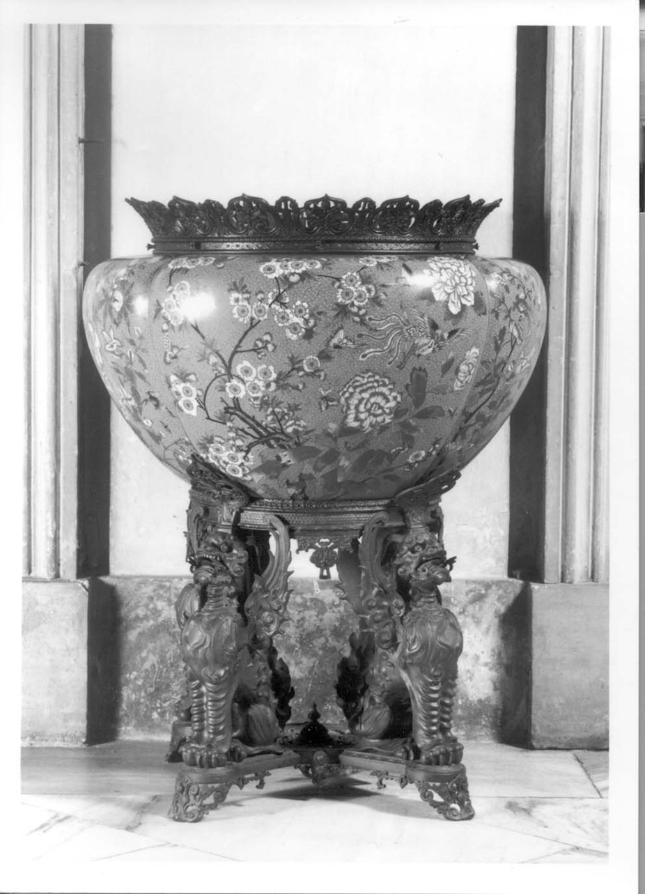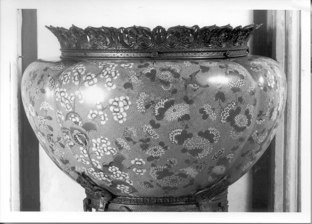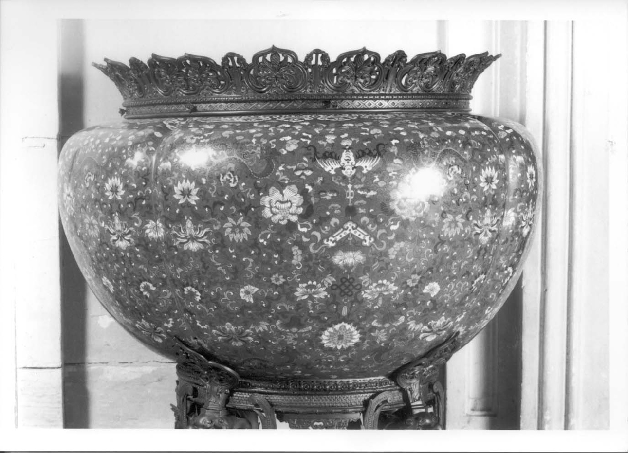 Vaso a sezione circolare di forma semisferica con coronamento in metallo traforato sull'imboccatura. Sei hanno lo sfondo color mattone su cui si stagliano fiori e draghi colorati; gli altri presentano una decorazione a piccoli fiori, farfalle ed uccellini su fondo azzurro