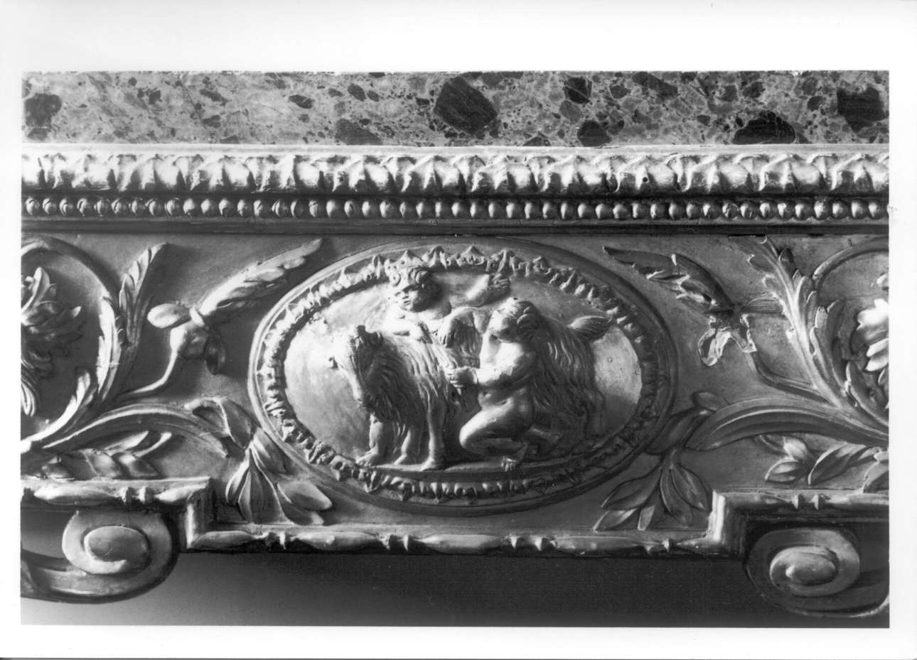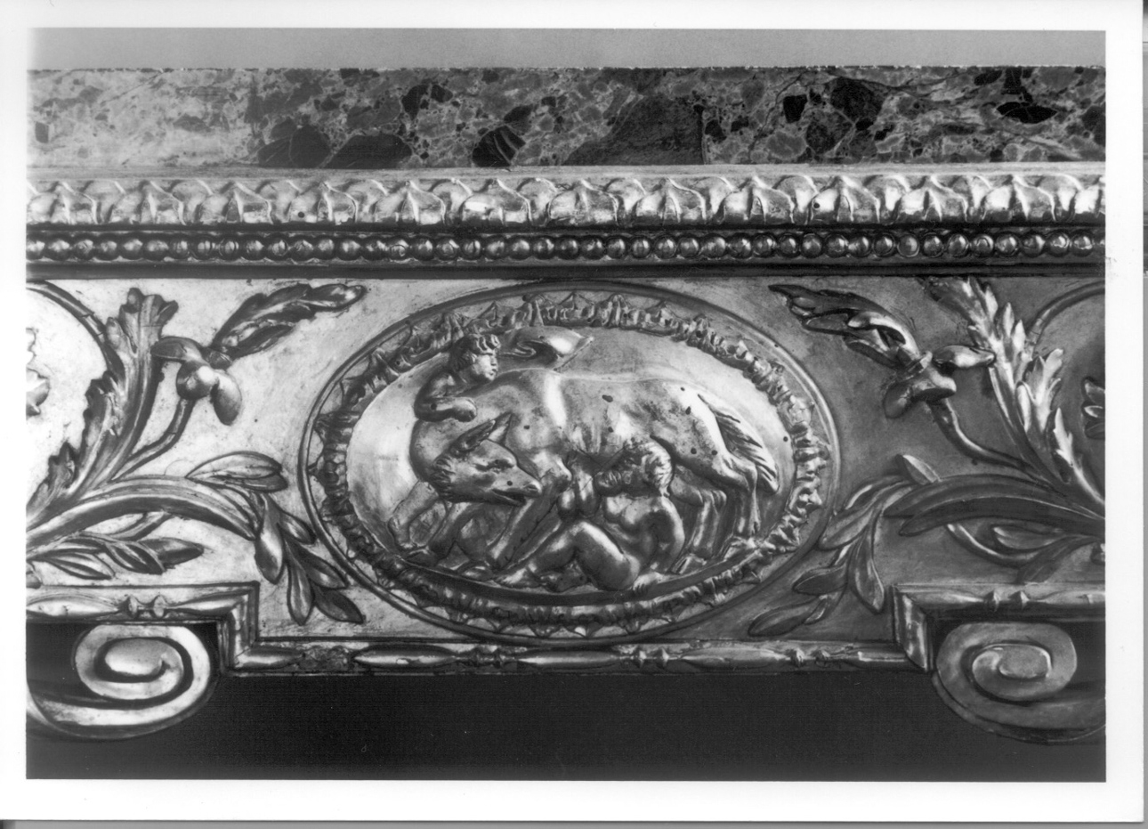 - NOTIZIE STORICO CRITICHE I numeri di inventario presenti sull'altra console sono i seguenti: a impressione: XR 1276; a pennello giallo su nero: R 2542. Nell'inventario del 1955 si dice: "idem. (con mascherone ovale al centro raffigurante la lupa che allatta Romolo e Remo) [a matita: foto]". La tipologia della console appartiene allo stile Luigi XVI, in voga nell'ultimo quarto del Settecento, caratterizzato dalla riscoperta della classicità, del rigore e della simmetria. In questo caso la decorazione del fregio è occupata da volute floreali, e trova il suo culmine nel medaglione centrale, con la rappresentazione mitologica della Capra Amaltea che allatta Giove sulla prima, e la lupa con Romolo e Remo sulla seconda [codifica Iconclass 96C(Romolo)122]; le teste femminili sugli angoli enfatizzano la classicità della composizione. Molte altre consoles di epoca neoclassica nel Castello di Racconigi mantengono questo tipo di composizione e questo andamento decorativo: si veda N. Gabrielli, Racconigi, Torino 1972, pp. 92, 94, 96; altre con cui si possono confrontare sono quelle presenti nelle collezioni di Palazzo Pitti a Firenze: E. Colle, I mobili di Palazzo Pitti. Il primo periodo lorenese (1737-1799), Firenze 1992, p. 35 e p. 59