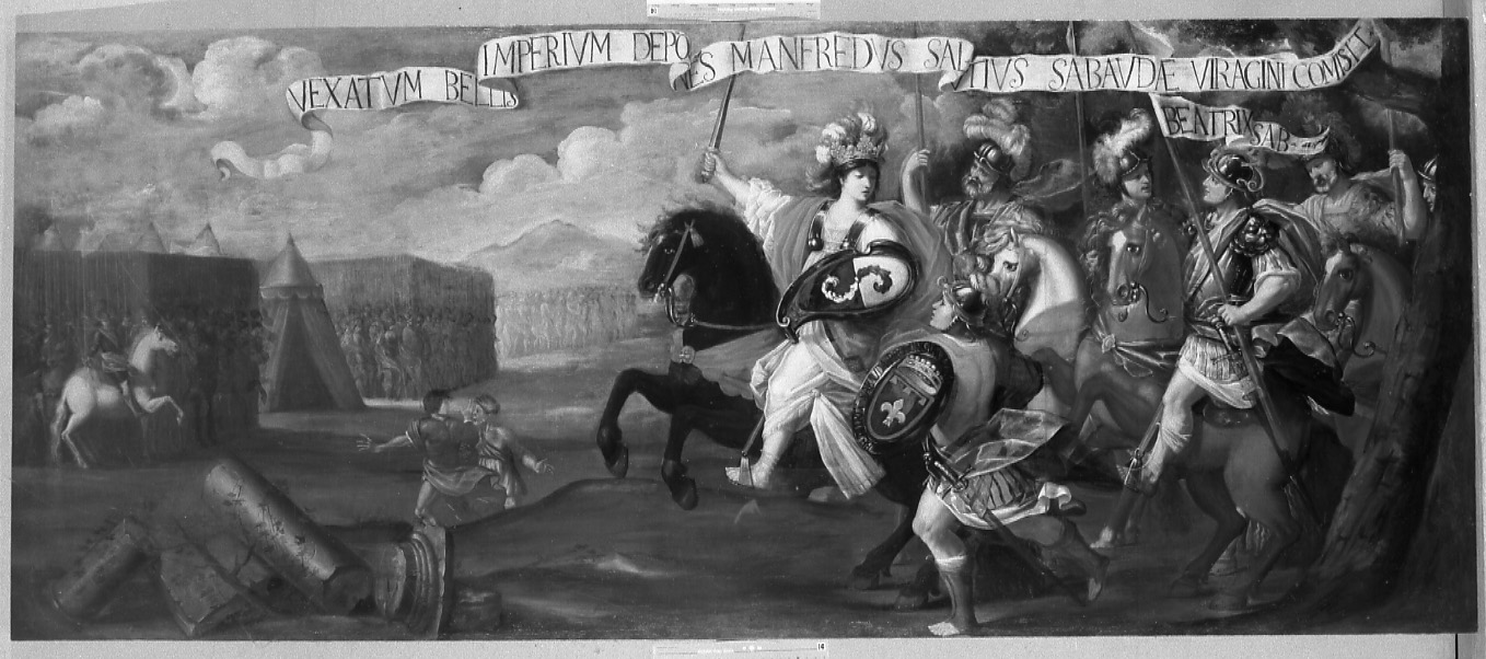 - NOTIZIE STORICO CRITICHE La tela fa parte del fregio, costituito da dodici dipinti raffiguranti "fatti eroici di prencipesse della R.le casa di Savoja", documentati dall'Inventario Allemandi del 1682 nella Anticamera del "Palasso Nuovo", ambiente contiguo alla Camera della Concordia, dove il fregio era invece costituito da un'ulteriore serie di dodici tele con "fatti eroici di diverse principesse forastiere maritate nella Real Casa di Savoia" ( cfr. M. DI MACCO, in G.ROMANO, a cura di, Torino 1988, pp 42-157, in particolare p.136). Le decorazioni dei due ambienti erano state originariamente progettate nell'ambito dei nuovi allestimenti in vista delle nozze di Carlo Emanuele II con Francesca di Valois Orleans, celebrate nel 1663. La nuova sposa di Carlo Emanuele II Maria Giovanna Battista di Savoia Nemours, duchessa dal 1665, non volle evidentemente però occupare gli ambienti destinati alla defunta prima moglie e fece invertire la destinazione degli ambienti occupando le sale verso il cortile, dove vennero adattati i fregi con le storie delle principesse, ma non vennero modificate le decorazioni delle volte, che inneggiano infatti a virtù prettamente maschili.Le due sale vennero smembrate in epoca carlo-albertina per far posto all'allestimento palagiano dell'attuale Sala da Ballo e i dipinti trovarono alloggio provvisorio presso il Castello di Moncalieri, per rientrare nei depositi di Palazzo Reale solo nel 1925 (C.E. BERTANA, 1989, pp 233-242).Clemente Rovere (Torino 1858, p. 162 e p.213 n 112), ricordava l'allestimento precedente al 1835 e indicava tra gli autori della serie dell'Anticamera i pittori Giovanni Bosso, Andrea Casella e Carlo Maccagno. Andreina Griseri (EAD, 1983, pp. 70-79) riconobbe in Emanuele Tesauro l'ispiratore programmatico dell'iconografia del ciclo e l'autore delle iscrizioni che accompagnano ogni scena delle due sale, riconoscibili nel testo delle Inscriptiones (E. Tesauro, Torino 1666, pp. 167-178), attribuì due tele a Francesco Nuvolone (le storie di Ludovica e di Bona di Savoia, esposte poi nel 1989 alla mostra Diana Trionfatrice - per cui cfr. M. di Macco, scheda n. 134, in M.DI MACCO- G.ROMANO, a cura di, Torino 1989, pp. 120-122- quando, in occasione del restauro, emerse sul retro la firma di Giuseppe Nuvolone, fratello minore di Francesco), le altre al cantiere del Dauphin, attivo negli stessi anni alla Venaria, e ricollegò alla serie i pagamenti segnalati dal Vesme ad Andrea Mignata, per l'esecuzione delle iscrizioni del Tesauro sulle tele (Schede Vesme, Torino 1963-1982, ad vocem).Michela di Macco (1988, p. 136, n. 37 ) segnalava i pagamenti a Giovanni Pozzo (per 2 tele), a Carlo Maccagno (per due tele) e ad Amedeo Mignata (per una tela), e (1989, scheda n. 134, p. 121) e riconosceva inoltre la presenza di Amanzio Prelasca (per la tela con la storia di Beatrice) e dell'allievo di Dauphin Giovanni Luigi Buffo (per le storie di Adele e Margherita), già attivo nel cantiere del Palazzo nel 1661. Il recente completamento del restauro dell'intero ciclo (effettuato dal Laboratorio Nicola di Aramengo tra il 1996 e il 2002 e diretto da Paola Astrua), durante il quale sono emerse le firme dei pttori milanesi Agostino Santagostino e di Melchiorre Gherardini ha consentito ulteriori considerazioni sulla provenienza lombarda della serie (si vedano le schede di Paola Astrua in C. SPANTIGATI, a cura di, Torino 1996, p. 62, dove si mantiene l'attribuzione ad Amanzio Prelasca per le Storie di Beatrice di Savoia). Michela di Macco oltre ad individuare una committenza in direzione milanese per tutto il fregio, ipotizza che vennero però messe in opera solo sette tele di provenienza lombarda, mentre per le restanti ci si rivolse, come attestano i pagamenti già segnalati, a Giovanni Pozzo, Carlo Maccagno e Amedeo Mignata. A Melchiorre Gherardini, la cui sigla compare sul dipinto con le storie di Maria di Savoia la di Macco attribuisce inoltre la tela con Anna Imperatrice dei Greci, mentre ad Agostino Santagostino, la cui firma compare sulle gesta di Ludovica nipote e sposa di Filiberto, la tela con Ludovica madre del re Francesco, e ancora, per considerazioni stilistiche, a Federico Bianchi la tela con Margherita figlia di Vittorio Amedeo VI (M. DI MACCO, in G. RECUPERATI,a cura di,Torino 2002, vol.IV, pp. 381-382).Se la "Prima anticamera verso il cortile" per cui Vesme (Torino 1963-1982, ad vocem) registra i pagamenti nel 1663 per 12 tele del fregio saldati ai pittori Luigi Buffo e Giovanni Carlone (per 6 dipinti), a Carlo Alessandro Maccagno (per 3 dipinti), ad Amedeo Mignatta (per una tela), a Domenico Tignola (per due tele), si può identificare con la sala delle Principesse sabaude, ipotizzando che nello del 1665, attestato dall'inventario Allemandi del 1682, si fosse mantenuta la successione delle tematiche iconografiche delle due sale, è possibile affermare ... (continua nel campo Osservazioni)