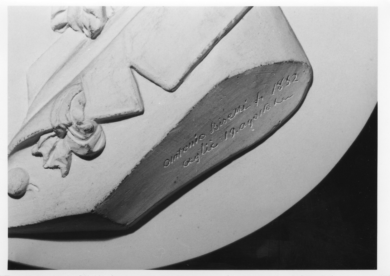 - NOTIZIE STORICO CRITICHE Il busto ritratto del Marchese Cesare Pallavicini, aiutante di campo del Duca di Genova, medaglia d'argento al valor militare, risulta eseguito da Antonio Bisetti ad Agliè il 19 agosto 1852, come risulta dalla firma apposta sullo spaccato della spalla sinistra. Del Marchese Pallavicini si conserva in Castello un altro ritratto, perfettamente corrispondente a quello qui esaminato, forse da riferire però a una forma cosidetta "di seconde impronte", cioè derivata già da un calco positivo (cfr. A. Giusti, a cura di, Sculture da conservare. Studi per una tecnologia dei calchi, Milano 1990, pp. 93-100), riconoscibile negli inventari solo a partire dal 1908. Il ritratto in esame appartiene ad una serie di diciannove bassorilievi in gesso conservati nella sala di passaggio della zona nota come Appartamento Chierici, perché utilizzata dal soprintendente responsabile dei restauri e della musealizzazione del castello, ma originariamente denominata "Foresteria sopra le serre", nel mezzanino tra il piano terra e il primo piano (E. Gabrielli, Le decorazioni e gli arredi, in D. Biancolini, E. Gabrielli, a cura di, Il Castello di Agliè. Gli Appartamenti e le Collezioni, Torino 2001, pp. 80, 102 nota 478). Della serie, eseguita da Bisetti tra il 1852 e il 1854, fanno parte, accanto ai ritratti del Duca Ferdinando di Savoia e della Duchessa Elisabetta, quelli della sua Dama d'onore la Contessa Carolina di Villamarina di Campo, del Gran Mastro il Marchese D'Angrogna e di suo figlio Alessandro Gentiluomo di Corte, delle Dame di Palazzo le Contesse della Valle, di Germagnano e Villanova, dei Cavalieri di Compagnia i Marchesi di Villanova, di Sommariva, Asinari di S. Marzano, Lamba Doria e Pallavicini e degli Ufficiali della Casa Militare del Duca il Cavaliere Luigi Prina Intendente Generale, il Marchese Nicolò Rapallo, il Conte Luigi Avogadro di Quaregna e il Marchese Ambrogio Doria. La serie è parzialmente ricordata nelle collezioni del castello a partire dall'inventariazione degli oggetti d'arte compilata dal pittore Sampietro nel 1855, che segnala il ritratto in questione nella "Camera di passaggio" al numero 398, e in quella successiva del 1857, che nella "Saletta di Parata LXII" dei "Mezzanini Inferiori al 1° piano Nobile", al numero 641, ricorda solo "sedici bassi rilievi in gesso" già abbinati alle cornici nere ancora presenti. Non rintracciabile nel 1876, la serie è nuovamente segnalata al completo nel 1908 nell"Anticamera appartamentino N.° 73", dove il ritratto del Marchese Pallavicini è registrato al n. 4440. Nel 1927 i "picoli quadri in gesso" del Bisetti sono inventariati nella "Camera di passaggio (6)" degli "Appartamenti delle LL. AA. RR. il Principe Tomaso di Savoia, Duca di Genova e della Principessa Bona (dal N. 2 al N. 28)", segnalando in particolare al n. 182 quello del Marchese Pallavicini. L'inventario del 1964 li registra ancora nella stessa collocazione, cioè nella "Foresteria sopra le serre" "entro cornice nera, quadrata esternamente e tonda nell'interno", valutati in generale 2.500 lire.Lo scultore Antonio Bisetti, originario di Novara, compiuti i primi studi a Varallo (1828-1829), con i fondi stanziati dal Collegio Caccia di Novara, si trasferisce in seguito a Torino e a Roma, dove è allievo di Carlo Finelli, collaboratore nello studio di Thordvalsen. Presente alle esposizioni della Società Promotrice di Belle Arti di Torino dal 1849 (cfr. A. Panzetta, Dizionario degli scultori italiani dell'Ottocento e del primo Novecento, v. I, Torino 1994, p. 50), per il Castello di Agliè Bisetti esegue anche altre opere quali il busto di Gregorio XVI ora nella Galleria d'arte, databile intorno alla metà del XIX secolo e un bassorilievo in marmo rappresentante la Duchessa di Genova a cavallo, ancora segnalata da A. Bertolotti nel 1869 nella "Camera in capo alla Galleria del teatro verde". Lo stesso autore oltre a segnalare i bassorilievi in questione, definiti "lavori per lo più del Bisetti", sempre collocati nei "Mezzanini, nei quali trovasi l'appartamento di S.A.R. la Duchessa di Genova e dei Principi", accenna all'attività di restauratore del giovane scultore, relativamente ad alcuni reperti antichi rinvenuti nella villa della Ruffinella presso Roma nel 1839 e condotti ad Agliè, con particolare riferimento alla statua marmorea di Giove coi fulmini (A. Bertolotti, Passeggiate nel Canavese, Ivrea 1869, p. 28). Nel 1846 è infine pagato 1000 scudi a saldo del prezzo "convenuto della Statua in marmo rappresentante S. M. il Re Carlo Felice, in acconto dei quali furono pagati scudi 850, come risulta dai Mandati N. 453 del 1843, N. 273, 475 del 1845; N. 332 e 458 del 1846 e così per saldo totale scudi 150" (ora a Torino, Palazzo Chiablese; ASTO, Duca di Genova. Casa di Maria Cristina, Carte Varie, mazzo 42, fasc. 4, mandato N. 253)