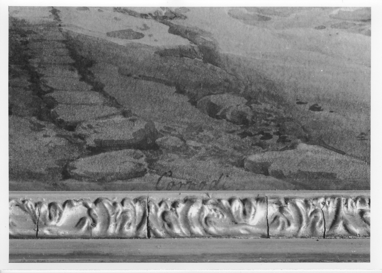- NOTIZIE STORICO CRITICHE Il dipinto è firmato da Salomon Corrodi (Fehraltorf in Svizzera 19 aprile 1810-Como 4 luglio 1892), artista appartenente ad una famiglia italiana rifugiata in Svizzera in seguito alla persecuzione dei valdesi. Dopo aver studiato a Zurigo con il paesaggista Wetzel, al cui seguito fece i primi viaggi, nel 1832 partì per l'Italia, dove visitò Genova e Pisa, e si stabilì a Roma, dove frequentò l'atelier di Thorwaldsen. Viaggiò molto ma risiedette sempre a Roma, dove fu nominato professore e membro onorario dell'Accademia di Belle Arti. All'inizio della carriera si era servito della tecnica ad olio ma "ben presto passò all'acquerello, che gli fu più congeniale e che gli permise di raggiungere ottimi risultati, oltre a un notevole successo di mercato per le sue vedute di Roma e della Campagna romana, del golfo di Napoli, di Ischia, della Riviera ligure e dei vari luoghi da lui via via visitati nei suoi viaggi" (cfr. scheda biografica in "Dizionario biografico degli italiani", Roma v. 29 1983, pp. 534-535 di Magnani S.). "I suoi acquerelli, di esecuzione accurata, di finissima intonazione e dall'atmosfera suggestiva per i colori soffusi che sfumano i piani, rivelano sempre una mano abilissima" (cfr. V. d'Erme - R. Mammuccari - P. E. Trastulli, "Le paludi pontine. Un mondo scomparso", Roma 1984, pp. 245-246). Dipinti di Corrodi sono piuttosto rari nel territorio piemontese: dalla consultazione della banca dati relativa alle esposizioni della Società Promotrice delle Belle Arti di Torino emerge che espose a Torino soltanto tre acquerelli nel 1880. Probabilmente l'opera in esame fu acquistata a Roma dalla regina Maria Cristina di Borbone, che fin dal 1825 insieme a Carlo Felice aveva promosso gli scavi nel territorio dell'antica Tuscolo e raccolto le antichità ivi rinvenute nel castello di Agliè. Dopo la morte del marito, nel 1831, la regina risiedette per un anno a Napoli e poi fece ritorno in Piemonte, da cui si allontanava d'estate per dimorare alla Rufinella.Recentemente sono stati pubblicati alcuni studi, in occasione di mostre tenute a Roma, sulla pittura di paesaggio nella prima metà dell'Ottocento ed in particolare sulle vedute di località laziali; nei relativi cataloghi si trovano elementi di confronto per l'opera in esame. Nel Castello di Agliè si conservano altri due acquerelli del Corrodi: uno nella sala gialla al piano nobile raffigurante "Gli avanzi dell'anfiteatro di Cicerone alla Villa Tuscolana" e uno nella Galleria verde intitolato la "Villa Tusculana/ a di/ VII. ottobre MDCCCXXXIX/ SS. Gregorio XVI visita S.M. la Regina Maria Cristina". Quello in esame è inedito e a proposito di quello allestito nella Galleria si è scritto che sarebbe "l'unica tra le vedute della Rufinella commissionate da Maria Cristina ancora conservata nel castello di Agliè" (cfr. Giovanna Cappelli - Susanna Pasquali, a cura di, "Tusculum. Luigi Canina e la riscoperta di un'antica città", catalogo della mostra, Roma 2002, p. 63 e figg. 1; 2, pp. 57-65 cat. V3; cfr. E. Gabrielli, "Le committenze romane di Maria Cristina di Borbone regina vedova di Sardegna" in "Maestà di Roma da Napoleone all'Unità d'Italia, catalogo della mostra, Milano 2003, pp. 398-400). I dipinti di Corrodi sono menzionati da Bertolotti nella sua descrizione del Castello di Agliè: "Nell'alloggio del Principe di Carignano fra otto dipinti ad olio e quattro acquerelli nominerò ... La villa di S.M. la Regina Maria Cristina a Roma nel momento che Gregorio XVI, che ha pur qui Avanzi dell'anfiteatro di Cicerone alla villa Tuscolana e due acquerelli con vedute della Ruffinella" (Cfr. A. Bertolotti, "Passeggiate nel Canavese", Ivrea tomo III 1869, p. 29). La catena inventariale, dubbia per le possibili confusioni con altre vedute della Rufinella, rivela che la collocazione attuale è piuttosto recente e non corrisponde a quelle storiche