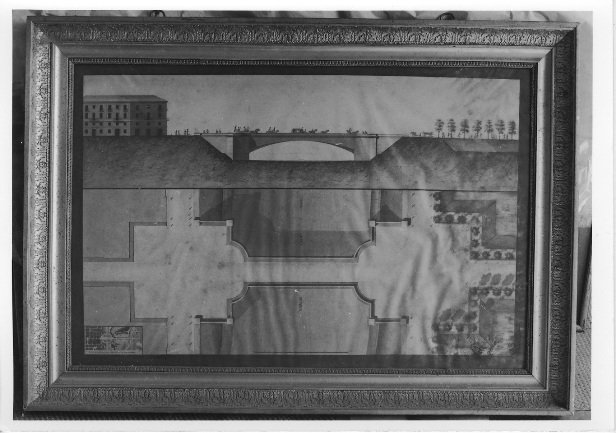 - NOTIZIE STORICO CRITICHE L'acquerello risulta censito negli inventari per la prima volta nel 1831 e da allora ha subito vari spostamenti all'interno del Castello tra i primo e il secondo piano nobile. Raffigura il progetto di Carlo Bernardo Mosca per il ponte sulla Dora che da lui prende il nome. Nato a Occhieppo Superiore il 6 novembre 1792, Mosca è ammesso all'Ecole Polytecnique di Parigi nel 1809 e dal 1811 continua gli studi presso l'Ecole des Ponts et Chaussées. Alla caduta di Napoleone fa rientro in Italia e diventa ufficiale del Genio Civile, svolgendo la sua attività in provincia di Savona prima ed in Piemonte a partire dal 1818. Nel 1819 è nominato Ingegnere Civile e Idraulico per l'Ordine Mauriziano e poi ingegnere-amministratore. La sua attività si articola in interventi sul patrimonio agricolo, opere di restauro e completamento di edifici privati, pubblici ed ecclesiastici. Dal 1820 al 1848 risulta membro del Congresso permanente e Consiglio Superiore di Ponti e strade. Carlo Alberto lo nomina Primo Architetto Idraulico, affidandogli la ristrutturazione di molti edifici della Casa Reale. Muore a Rivalta Torinese il 13 luglio 1867 (cfr. Vera Comoli, Laura Guardamagna, Micaela Viglino, a cura di, "Carlo Bernardo Mosca. Un ingegnere architetto tra Illuminismo e Restaurazione", Milano 1997).I primi accenni alla costruzione di un ponte sulla Dora in prosecuzione dell'attuale via Milano risalgono al 1817. L'ingegnere disegna un progetto audace per un ponte "retto, in pietra, ad un solo arco ribassato di 45 metri di corda e 5,50 di saetta. La costruzione dello straordinario manufatto, che incomincia nel 1823, deve concludersi, secondo il contratto, entro quattro anni" ma difficoltà tecniche e problemi burocratici spostano l'inaugurazione al 1830. Mosca, oltre al ponte, disegna un "tronco di strada, su di un terrapieno inclinato ... che deve attuarne il raccordo col piazzale d'Emanuele Filiberto" e nel progetto definitivo del 1825 comprende anche il piano urbanistico per l'intero quartiere (cfr. E. Castelnuovo-M. Rosci, a cura di, "Cultura figurativa e architettonica negli stati del Re di Sardegna 1773-1861", catalogo della mostra, Torino 1980, v. III pp. 1167-1169)