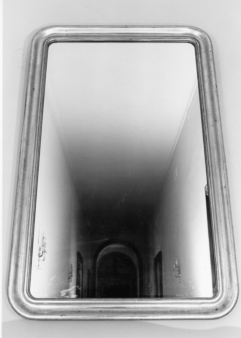 - NOTIZIE STORICO CRITICHE L'assenza di precedenti etichette, impedisce di verificarne la ulteriore provenienza, o dagli arredi di palazzo Dal Pozzo, o dalla dotazione della clinica Sanatrix, da eventuali donazioni o acquisti, o, infine, dalla precedente sede dell'Ente, presso il palazzo delle Segreterie di Stato, acquistato nel 1885. Da un punto di vista stilistico, l'oggetto presenta una decorazione e tipologia assai essenziali; difficilmente, però, benché lo specchio non sia originale, si tratta del reipiego della cornice di un quadro. Per un confronto, Cose antiche, n, 106-novembre, 2001, p. 46