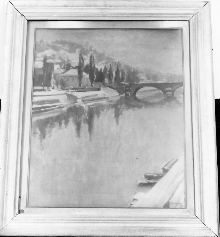 - NOTIZIE STORICO CRITICHE La tela di Giuliano Emprin (Torino, 1902-1991) venne acquistata dalla Provincia di Torino, unitamente ad altre opere esposte, secondo una politica di promozione degli artisti piemontesi già da tempo intrapresa dall'Ente, alla mostra della Società Promotrice delle Belle Arti del 1953, Esposizione Nazionale di Arti Figurative, catalogo della mostra (Torino, Palazzo della Società Promotrice delle Belle Arti, 3 maggio-29 giugno 1953), Torino, 1953, p. 6, n. 60. Da un punto di vista stilistico e di contenuto, l'opera appare caratteristica della produzione del pittore, allievo di Agostino Bosia, affermatosi oltre che nel panorama piemontese, alle Biennali veneziane e alle quadriennali romane, nel sesto decennio del Novecento. Il paesaggio è il genere caro al maestro, il cui stile è stato paragonato dalla critica a quello impressionista di Alfred Sisley (Parigi, 1839-Moret sur Loing, Parigi, 1899). Più propriamente, l'artista si inserisce nel solco della tradizione paesaggistica piemontese, amando la pittura "en plein air", le suggestioni rapide ed immediate. Frequenti nella sua produzione non solo le vedute dei dintorni di Torino nei pressi del fiume Po, ma soprattutto le tele di soggetto invernale che gli valsero importanti premi, ove la raffinata ricerca cromatica del pittore si sbizzarisce nel renderne i riflessi e le sfumature nelle varie ore del giorno, come ben testimonia l'opera in esame. La sapienza nel giocare sui toni di grigio è cara all'artista che nei soggiorni in Francia, Olanda ed Inghilterra ha potuto apprezzarne le peculiarità negli specchi d'acqua del Tamigi e della Senna che riporta anche nelle rappresentazioni del lungo Po, espressione di un mondo amato e rivisitato. Per un profilo dell'artista, G. Emprin. Catalogo generale delle opere a cura della Galleria Pirra di Torino, Torino, 1975, s.p.; E. Bellini, Pittori Piemontesi dell'Ottocento e del primo Novecento dalle Promotrici torinesi, Torino, 1998, pp. 153-154