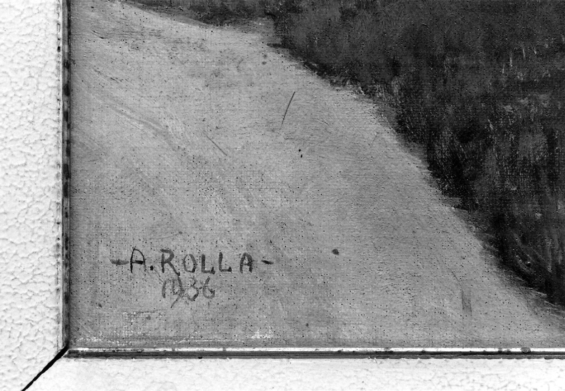 - NOTIZIE STORICO CRITICHE La tela venne acquistata, unitamente ad altre opere, dalla Provincia di Torino all'esposizione della Promotrice del 1942 per L. 1500, XIV Esposizione del Sindacato Interprovinciale Fascista Belle Arti in Torino, catalogo della mostra (Torino, Promotrice delle Belle Arti, maggio-giugno 1942), Torino, 1942, p. 24, n. 32. Nell'ambito della produzione di Adolfo Rolla (Buenos Aires, 1899-1967), allievo dell'Accademia Albertina e frequentemente presente nella prima metà del Novecento alle mostre torinesi, ma documentato anche a varie esposizioni italiane, il paesaggio costituisce un tema particolarmente caro all'artista e viene spesso trattato con estrema semplicità e disinvoltura. Per un breve profilo dell'autore, A. M. Comanducci, Dizionario illustrato dei pittori, disegnatori e incisori italiani moderni e contemporanei, vol. IV, Milano, 1962, p. 1618; E. Bellini, Pittori Piemontesi dell'Ottocento e del primo Novecento dalle Promotrici torinesi, Torino, 1998, pp. 357-358