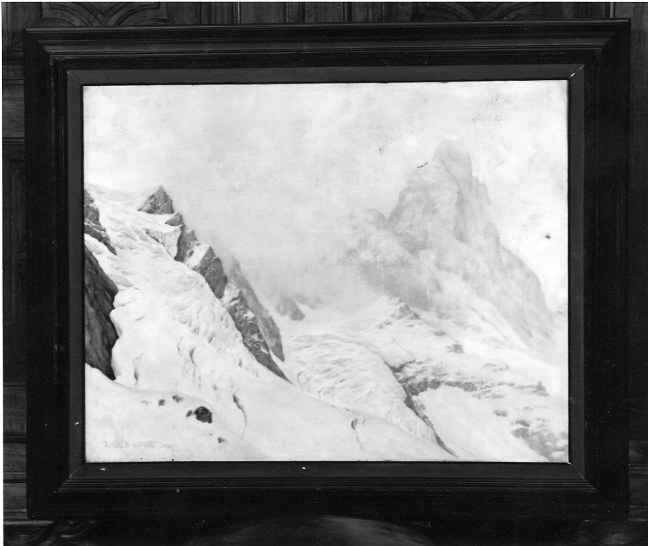 - NOTIZIE STORICO CRITICHE Diversamente da altri dipinti pressoché coevi all'esemplare in esame, acquisiti, secondo una politica di promozione degli artisti locali intrapresa dalla Provincia di Torino a partire dal quarto decennio del Novecento, alle esposizioni torinesi, non è stato possibile appurare, attraverso la ricerca archivistica, con quali modalità sia pervenuta alle raccolte dell'Ente. L'autore (Torino, 1900-Sallanches, 1985), di cui la Provincia di Torino conserva un notevole numero di tele, del tutto inedite ad eccezione di "Tormenta" (1941), si formò da autodidatta dedicandosi al paesaggio con netta prevalenza di scorci montani, amati al punto che il pittore fu anche buon alpinista. Risiedette dal 1933 a Sallanches, in Alta Savoia, e per lungo tempo a Courmayeur, Chamonix ed in Svizzera, luoghi ripetutamente rappresentati nelle sue opere. Data la famigliarità con il tema montano, con una particolare predilezione per le vette valdostane, numerose sue opere si trovano presso il Museo della Montagna di Torino ed egli collaborò con scritti e illustrazioni a periodici e riviste specialistiche italiane, francesi e svizzere. Fu assiduamente presente alle esposizioni torinesi della Promotrice e del Circolo degli Artisti, ma, soprattutto negli anni trenta/ quaranta espose ripetutamente anche a Milano, Genova e in Francia, A. Abrate, catalogo della mostra (Torino, Galleria Berman), Torino, 1986; E. Bellini, Pittori Piemontesi dell'Ottocento e del primo Novecento dalle Promotrici torinesi, Torino, 1998, p. 1 (con quotazioni di mercato). La cornice, sia per la presenza sul retro di etichette inventariali, sia per un'analisi stilistica, può essere considerata coeva al dipinto
