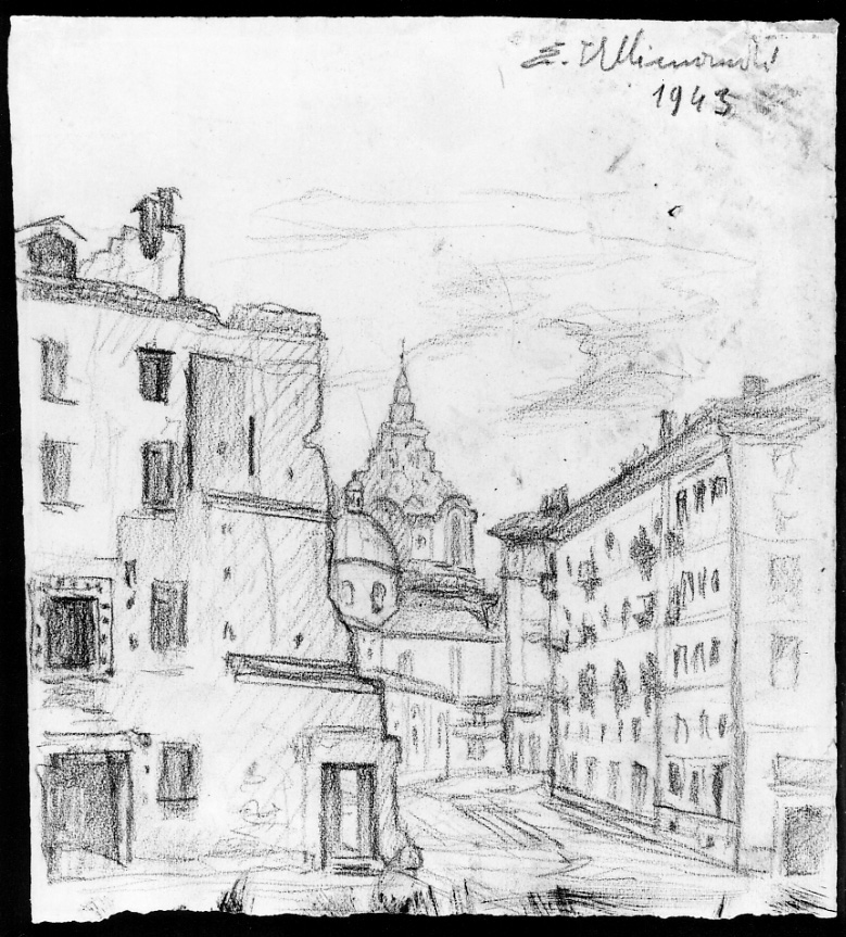 In primo piano, al centro, scorciata, è rappresentata una via cittadina in corrispondenza di un incrocio. Sulla destra un antico palazzo a quattro piani, con ricca cornice nella finestra centrale al piano nobile. Di fianco ad esso, mura diroccate di un edificio bombardato. Dall'altra parte della strada due palazzi affiancati di cinque e quattro piani. Segue un secondo incrocio al di là del quale, sulla destra si intravede lo spigolo di un palazzo, sulla sinistra parte della cattedrale di S. Giovanni con cupola all'incrocio dei bracci e dietro di essa, la cupola guariniana della cappella della SS.ma Sindone. Nella parte superiore del foglio ampio brano di cielo solcato da flebili tratti ad indicare le nubi.La composizione è resa in forme stilizzate. Il disegno è montato su passepartout in cartoncino bianco