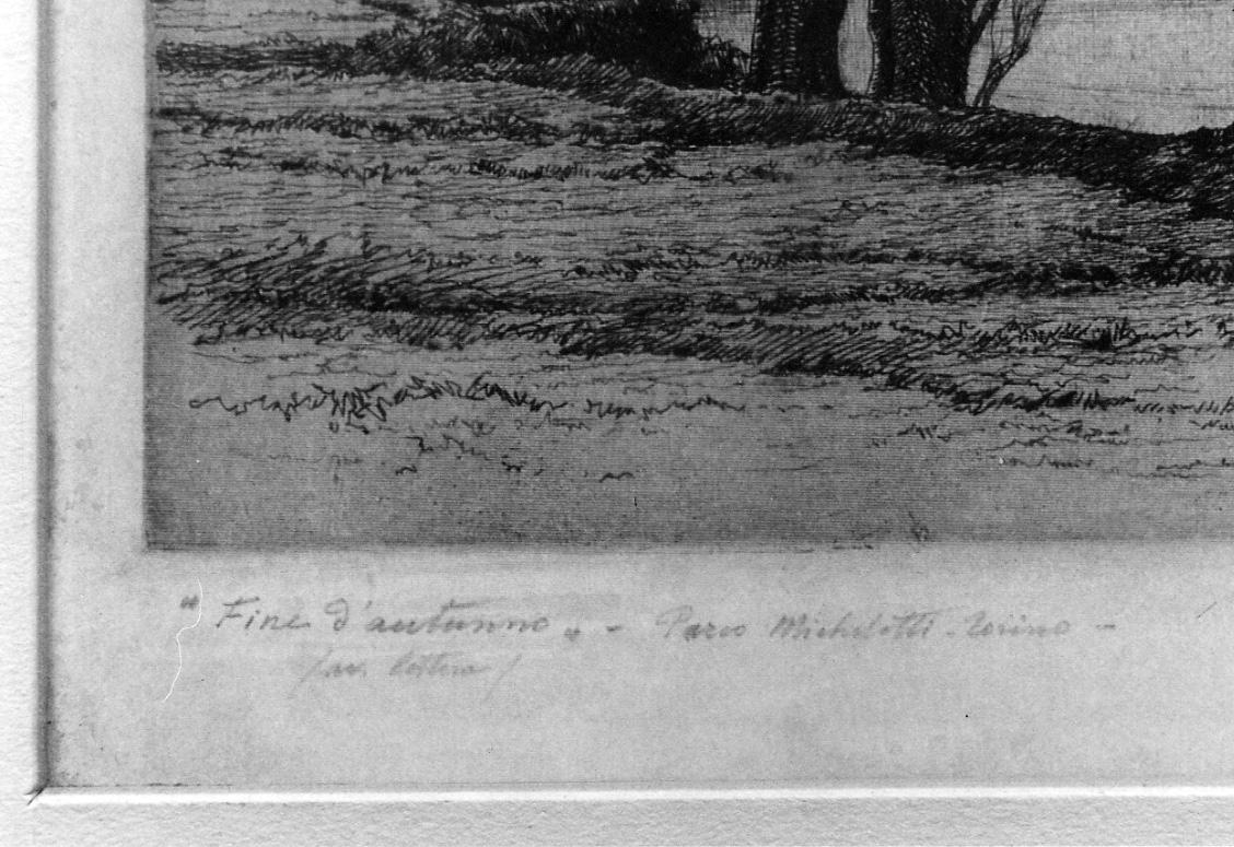 - NOTIZIE STORICO CRITICHE L'aquaforte di Marcello Boglione (Pescara, 1891-Torino, 1957) venne acquistata dalla Provincia di Torino, unitamente ad altre opere di artisti piemontesi, all'Esposizione della Promotrice di Torino del 1940, XII Esposizione del Sindacato Interprovinciale Fascista di Belle Arti in Torino, catalogo della mostra (Torino, Palazzo della Società Promotrice-Parco del Valentino, maggio-giugno 1940), Torino, 1940, p. 10, n. 127. L'incisione, unitamente alle altre due oggi conservate nel medesimo ambiente di c.so Lanza 75, venne esposta alla XXII Biennale di Venezia, con varie opere dello stesso autore, nella sala 14 a lui dedicata, La Biennale di Venezia/ XXII Esposizione Internazionale d'Arte, catalogo della mostra (Venezia, maggio-ottobre 1940), Venezia, 1940, p. 92, n. 14; ill. p. 80). Copie della stessa figurano a numerose importanti esposizioni, sia collettive che personali dell'artista, tra le quali si ricordi la mostra postuma del 1959 presso la Galleria Fogliato di Torino, ove venne presentata l'intera sua opera grafica. L'incisione rivela la grande qualità di disegnatore, oltre alla perizia tecnica d'incisore, caratterizzata da un tratto sottile; il soggetto rappresentato è uno dei prediletti dell'artista, per le possibilità degli effetti luminosi dei riflessi dell'acqua, l'intrico dei rami, i giochi di luce. A. Dragone, Boglione: L'artista e il maestro, in A. Dragone, F. Dalmasso, V. Gatti (a cura di), Marcello Boglione (1891-1957) un maestro dell'incisione all'Accademia Albertina, catalogo della mostra (Torino, Accademia Albertina di Belle Arti, marzo-aprile 1994), Torino, 1994, pp. 13-23; A. Dragone, Repertorio delle incisioni e delle litografie, ibidem, p. 46. Boglione, dopo aver compiuto gli studi a Nizza e a Roma come pittore, si trasferì a Torino nel 1921, affermandosi con l'attività di incisore e specializzandosi nella tecnica dell'acquaforte che gli valse prestigiosi riconoscimenti a livello nazionale ed internazionale; a seguito del successo ottenuto nel 1934 gli venne affidata la cattedra di professore d'incisione, da tempo caduta in decadenza, presso l'Accademia Albertina, incarico che ricoprì fino alla morte, creando una prestigiosa scuola ed ottenendo un seguito di numerosi allievi. Per un breve profilo, A. M. Comanducci, Dizionario illustrato dei pittori, disegnatori e incisori italiani moderni e contemporanei, vol. I, 1962, p. 214; con valutazioni economiche aggiornate, E. Bellini, Pittori Piemontesi dell'Ottocento e del primo Novecento dalle Promotrici torinesi, Torino, 1998, p. 48. La descrizione dettagliata del soggetto si trova in Annotazioni