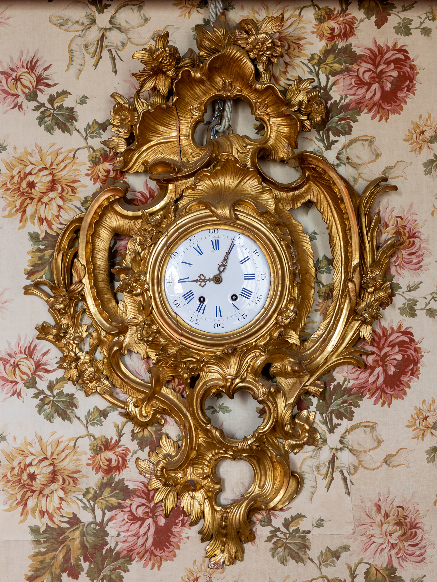 Quadrante incorniciato da una ghirlanda di fiori da cui si dipartono ampie volute asimmetriche rocaille e volute di foglie accartocciate con fiori.Ghiera del quadrante a fasce modanate.Quadrante bianco; cerchio delle ore con numeri romani in nero; cerchio dei minuti esterno con cifre arabe di cinque in cinque in nero; lancette disuguali, con volute, in rame dorato; due fori di carica